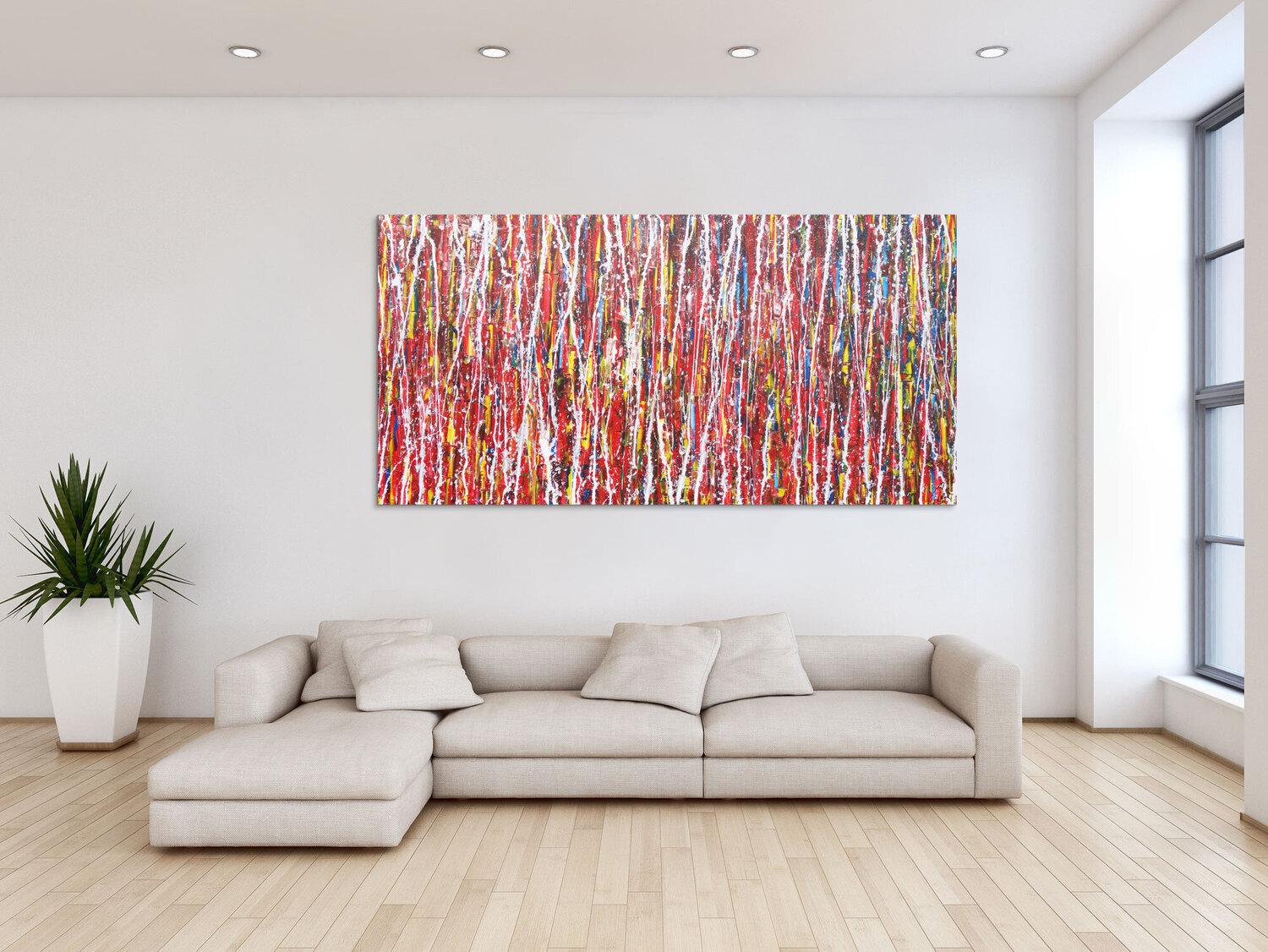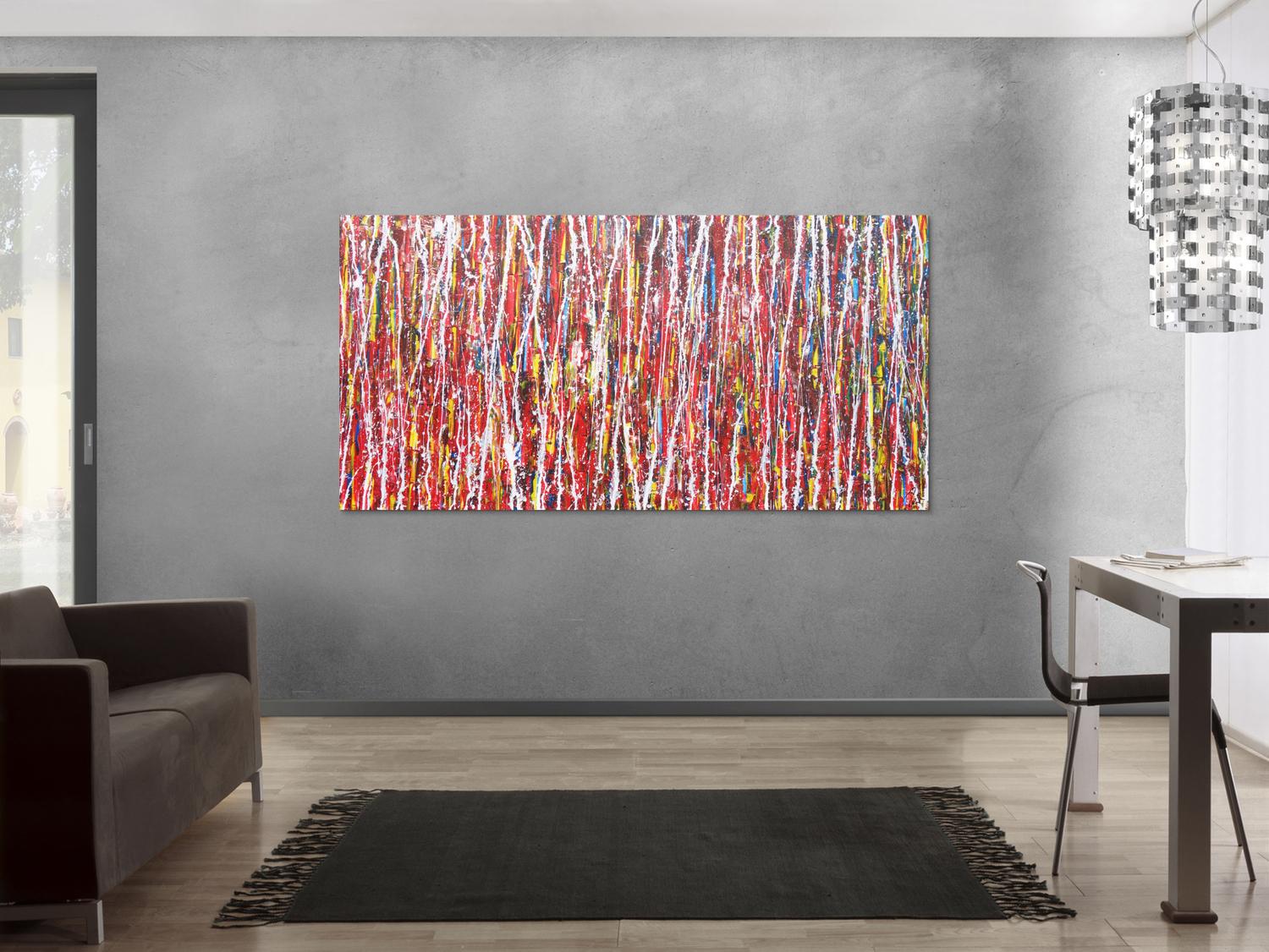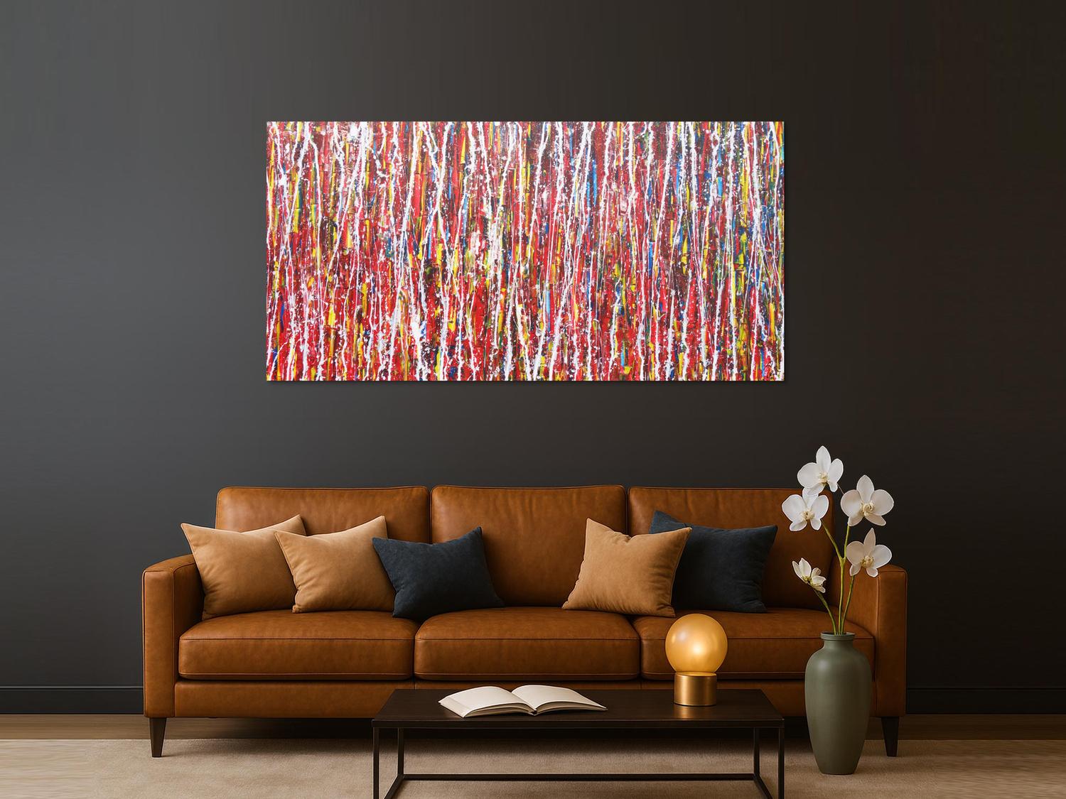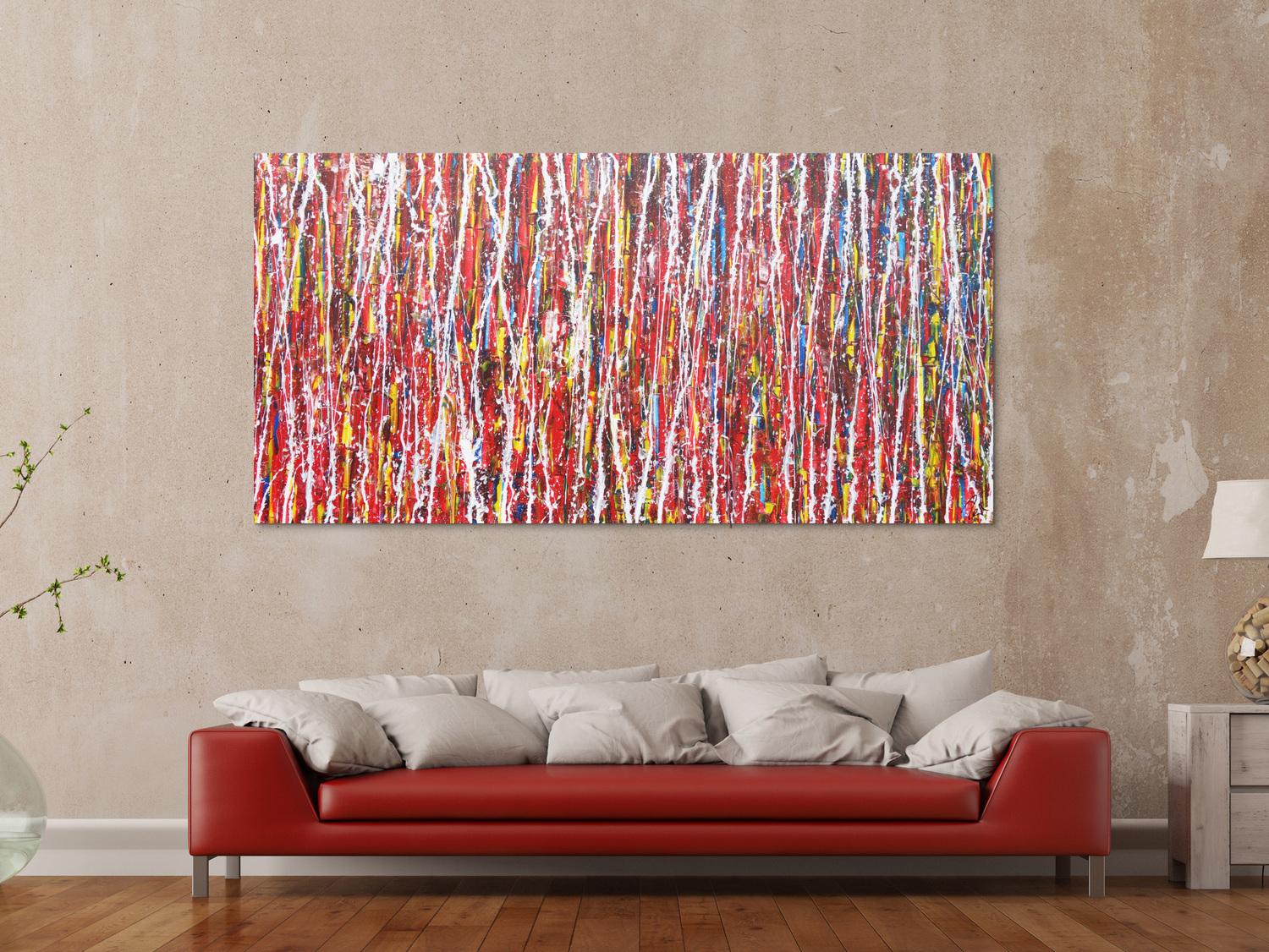 Abstraktes Gemälde auf Leinwand Abstraktes Acrylbild Action Painting bunt modern rot weiße Streifen zeitgenössisch in 100x200cm von Alex Zerr
