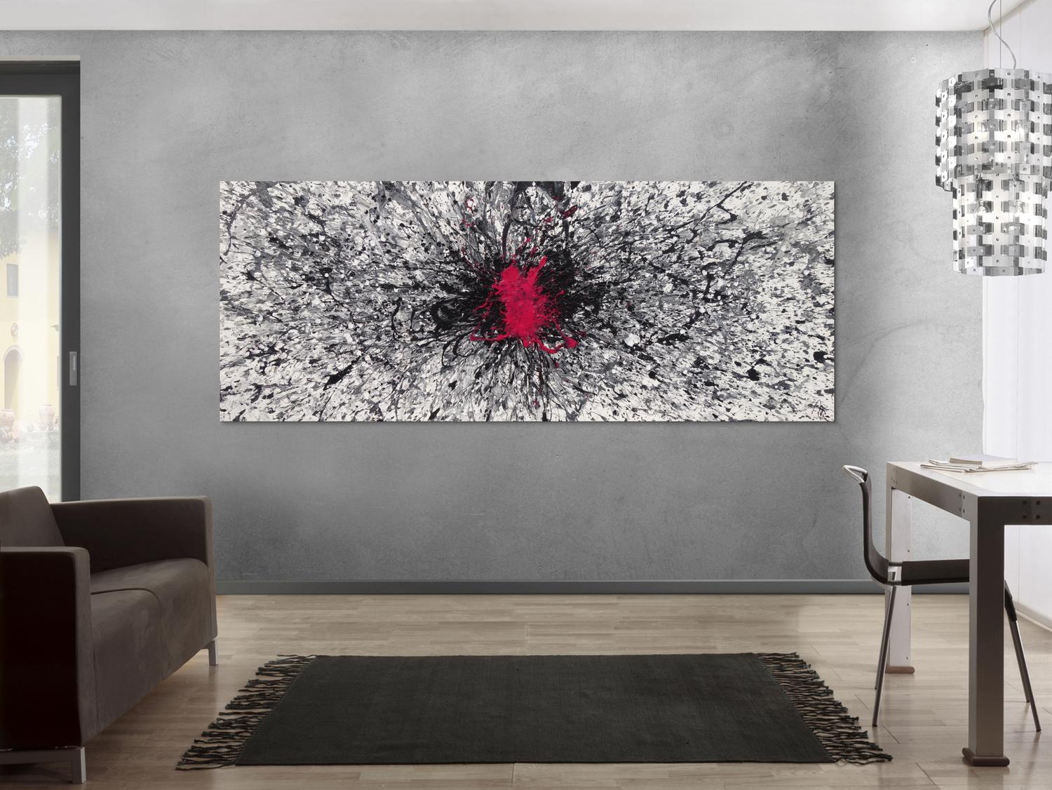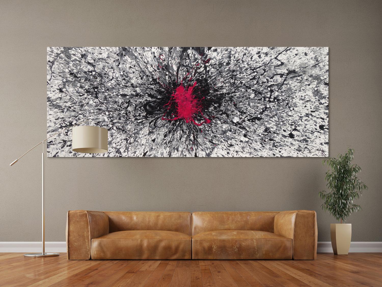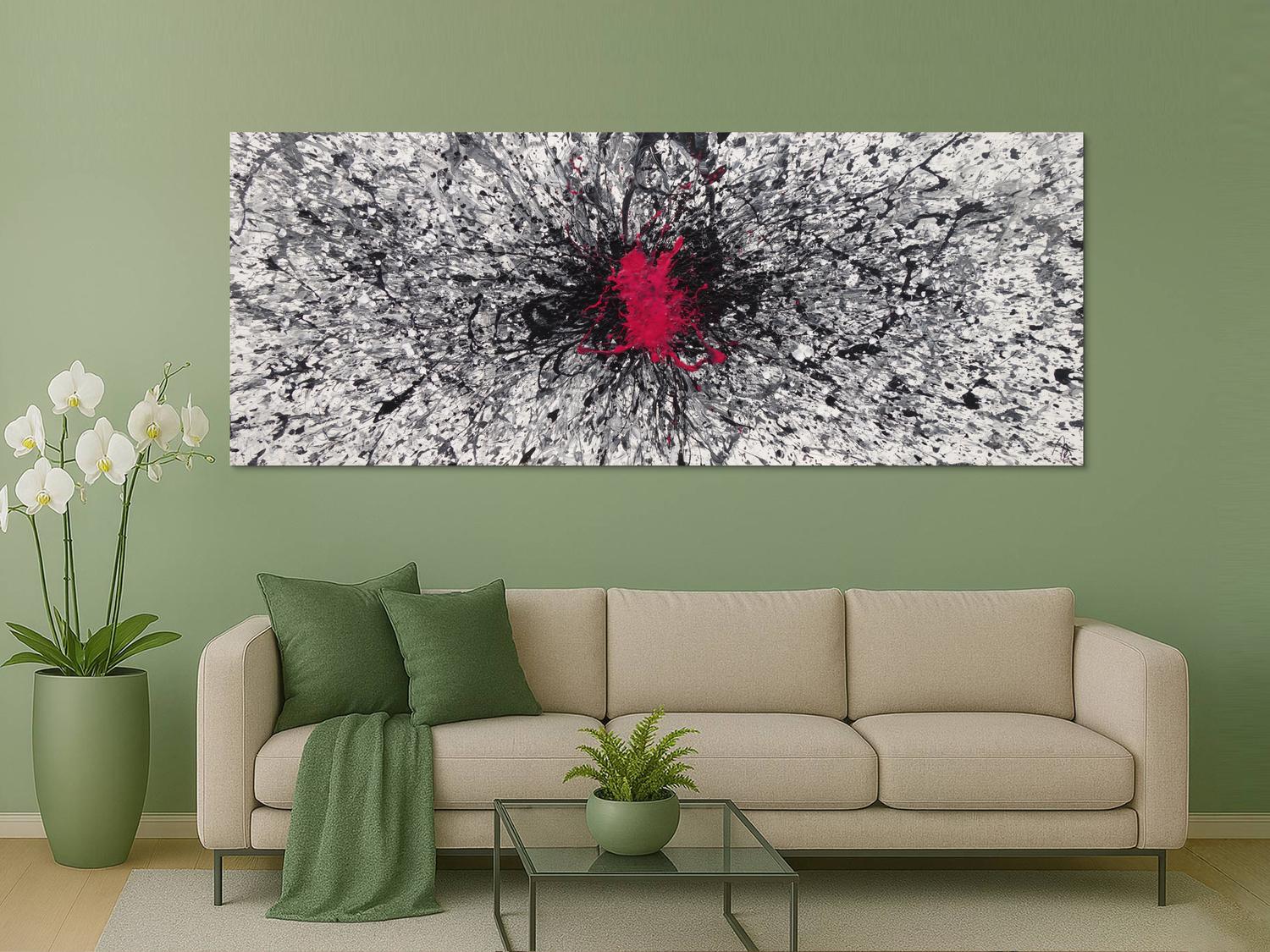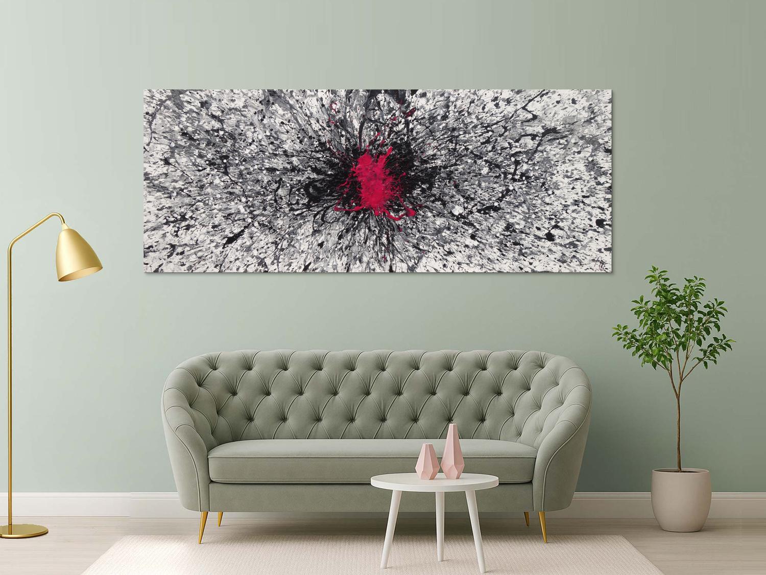 Abstraktes Gemälde auf Leinwand Abstraktes Acrylbild Action Painting glau weiß schwarz Fleck in Magenta Splash Art Zeitgenössisch in 100x250cm von Alex Zerr
