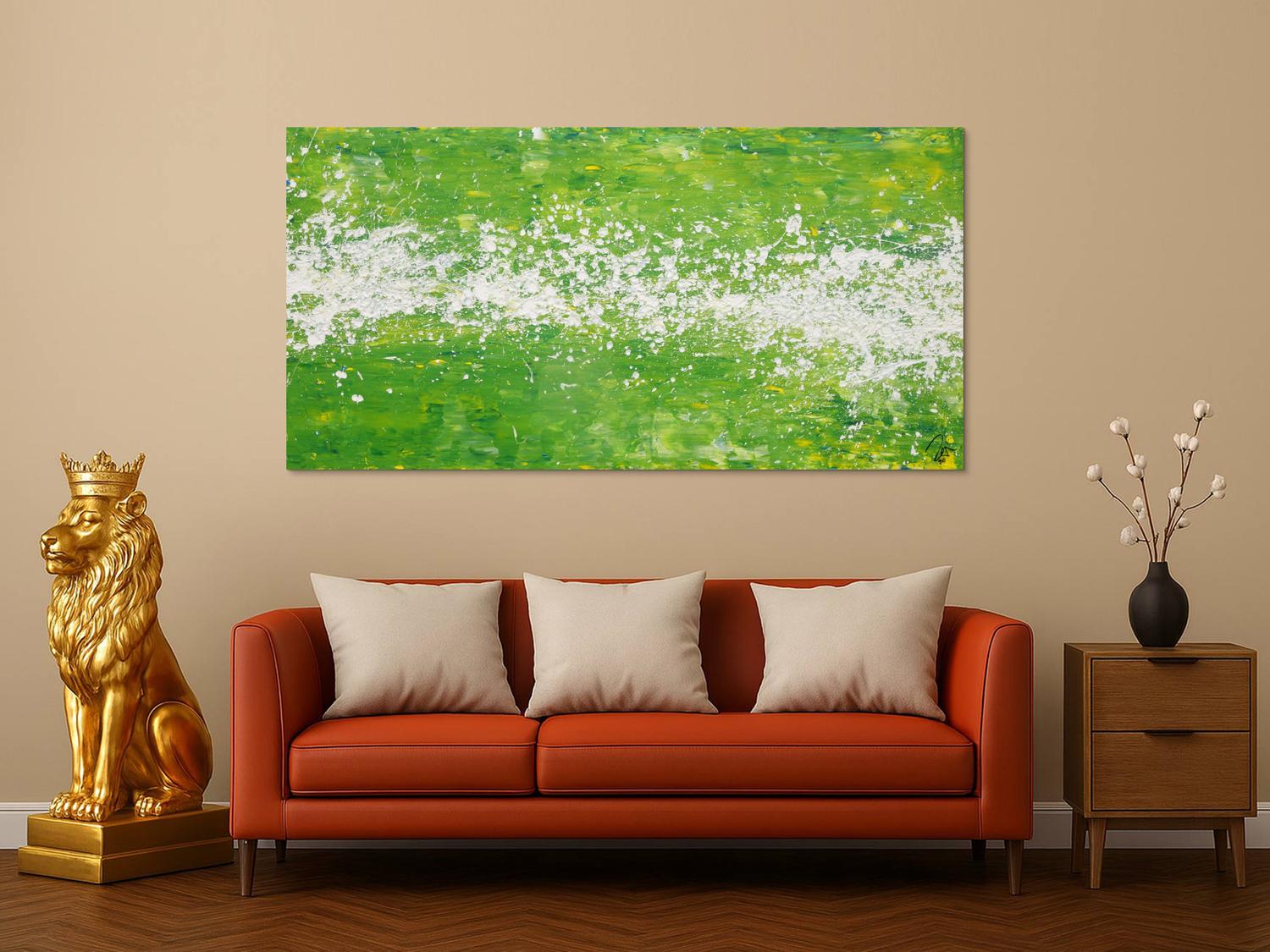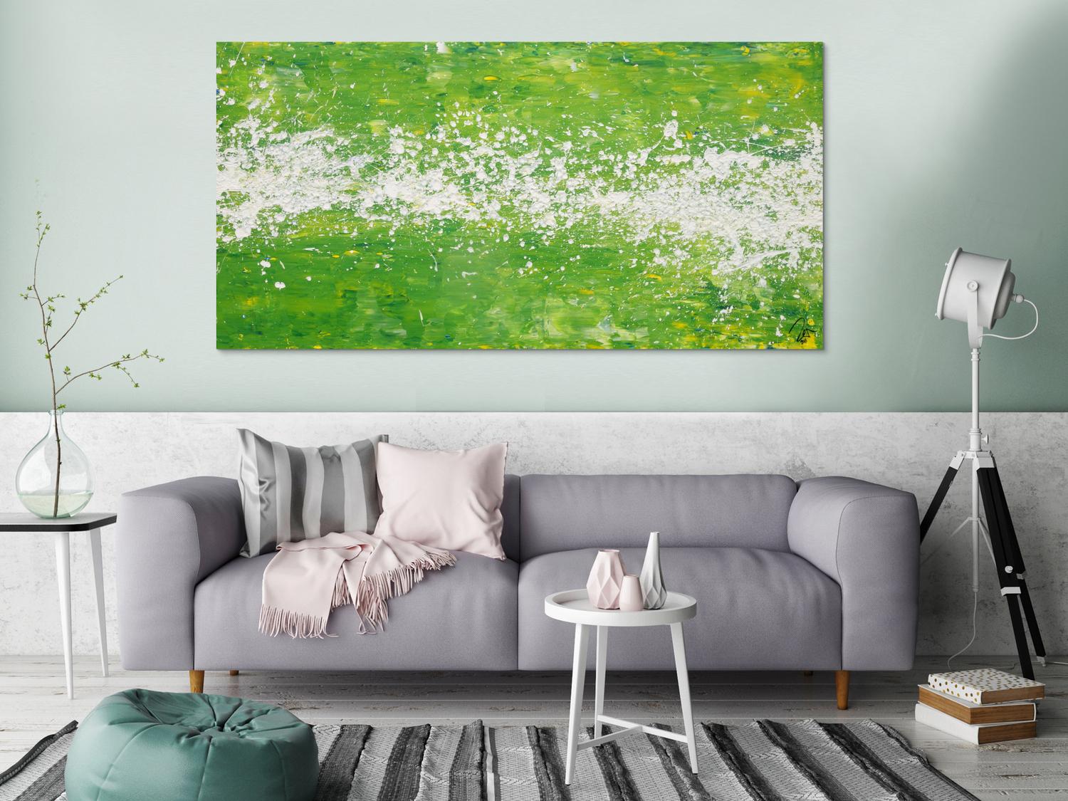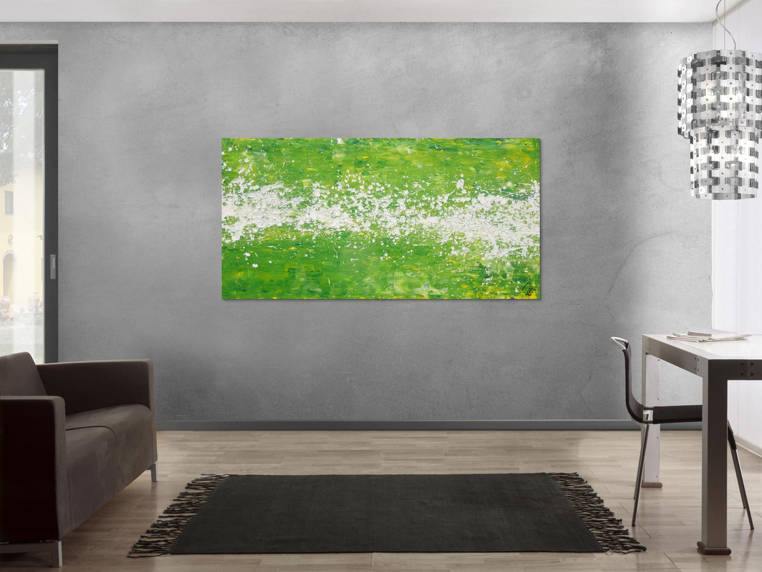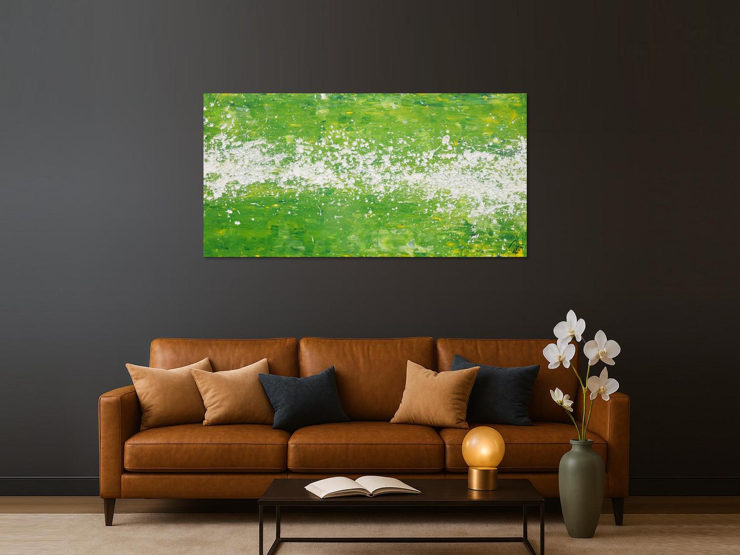 Abstraktes Gemälde auf Leinwand Abstraktes Acrylbild Action Painting grün weiß zeitgenössisch modern expressionistisch in 90x180cm von Alex Zerr
