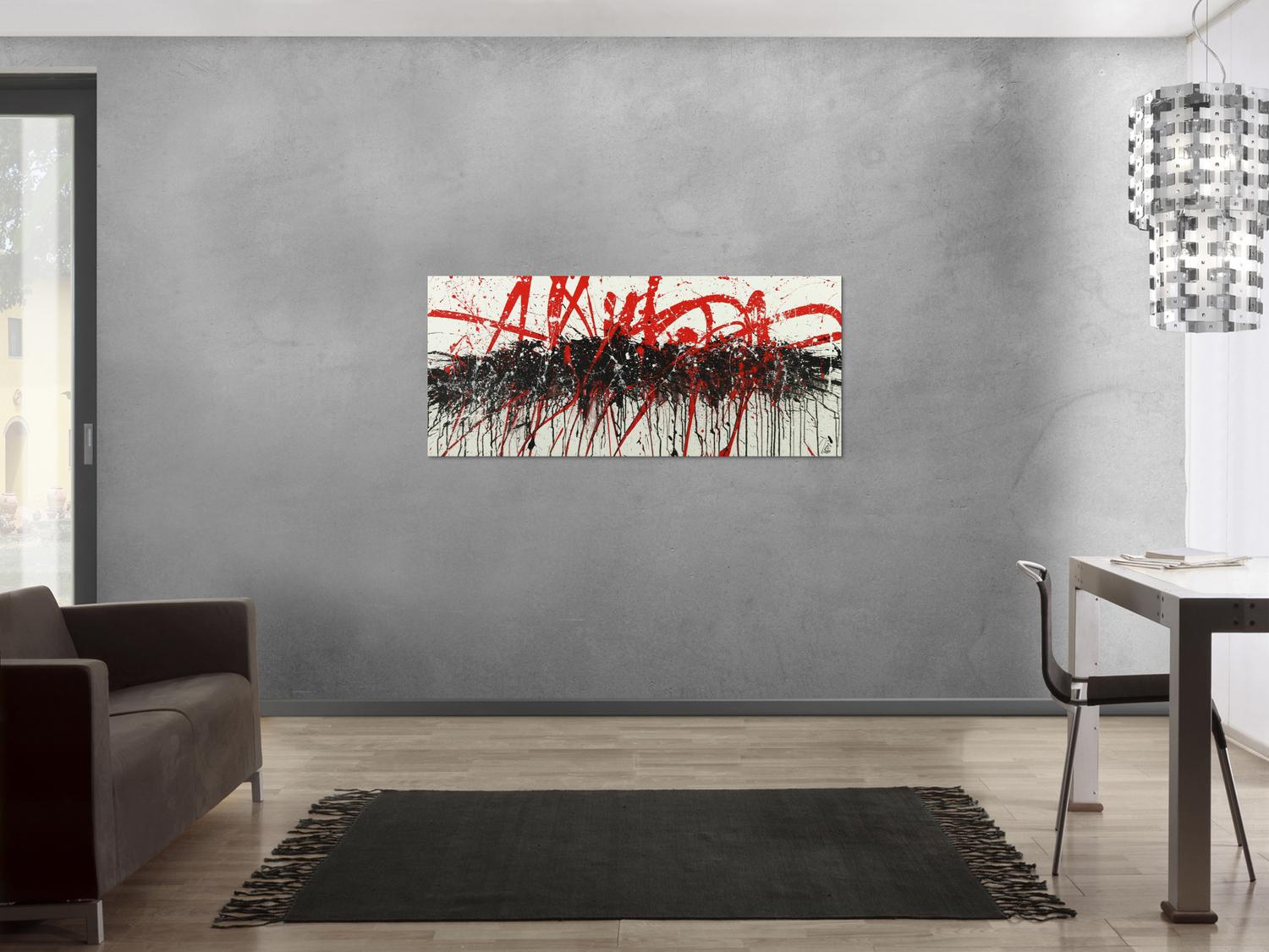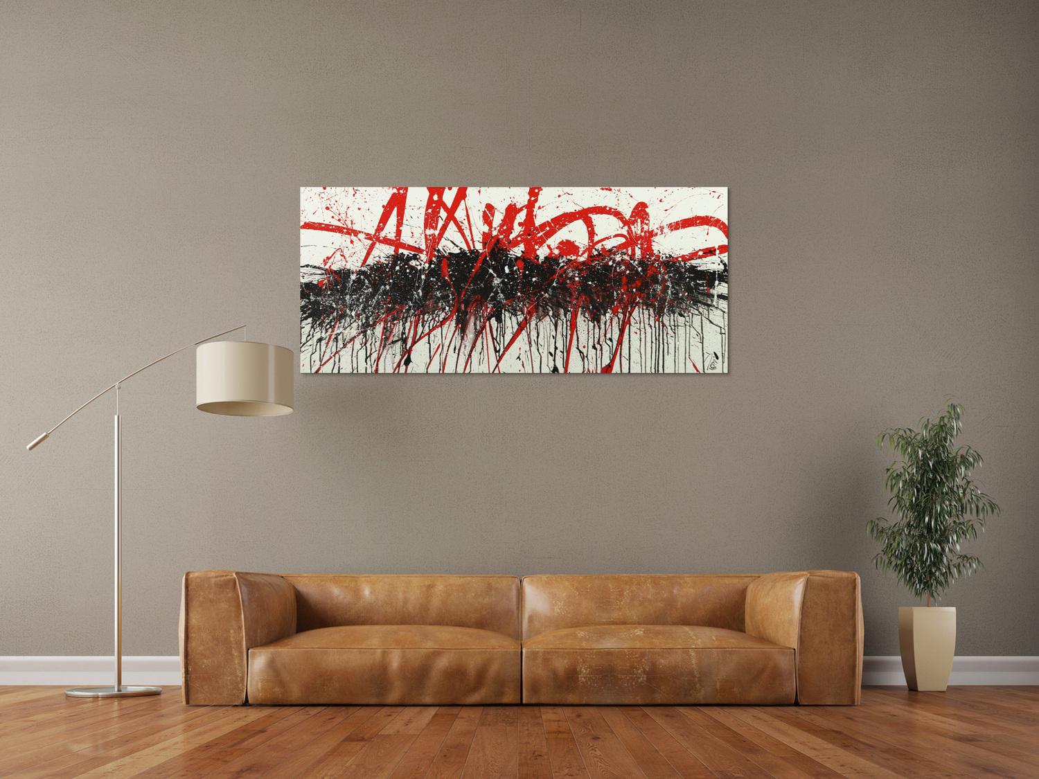 Abstraktes Gemälde auf Leinwand Abstraktes Acrylbild Action Painting handgemalt auf Leinwand schwarz weiß rot in 60x140cm von Alex Zerr