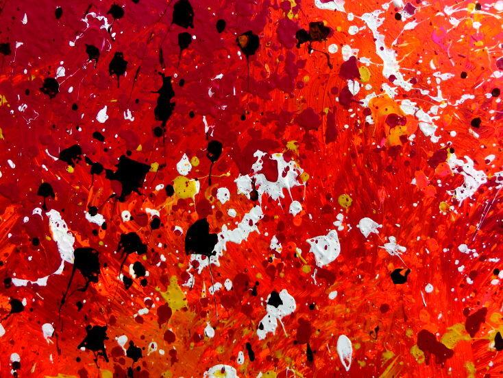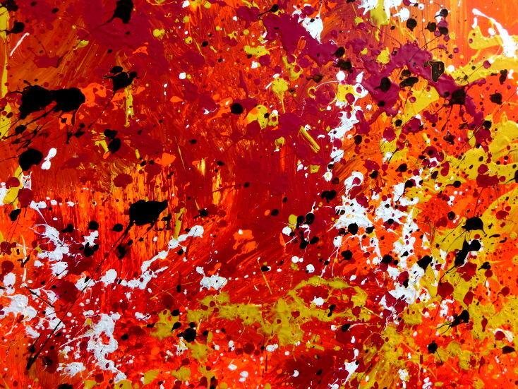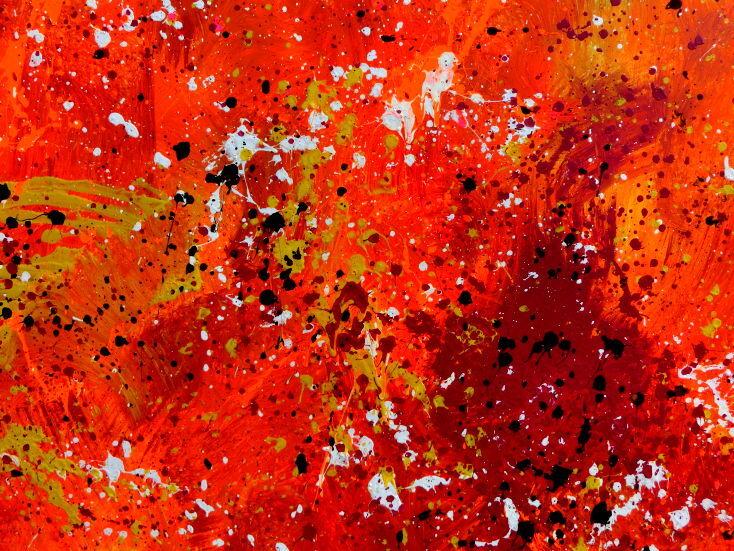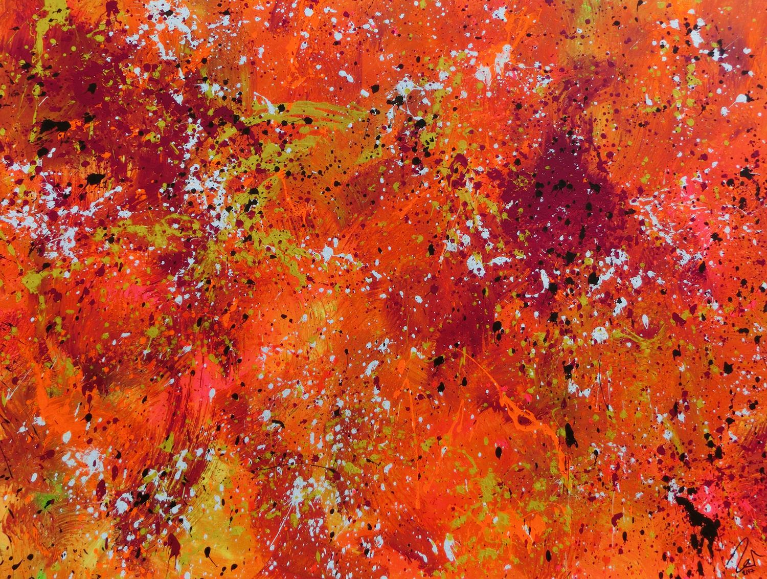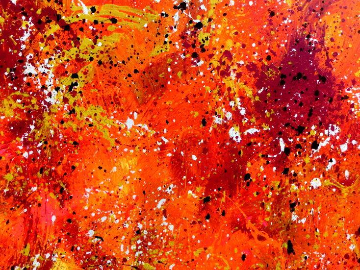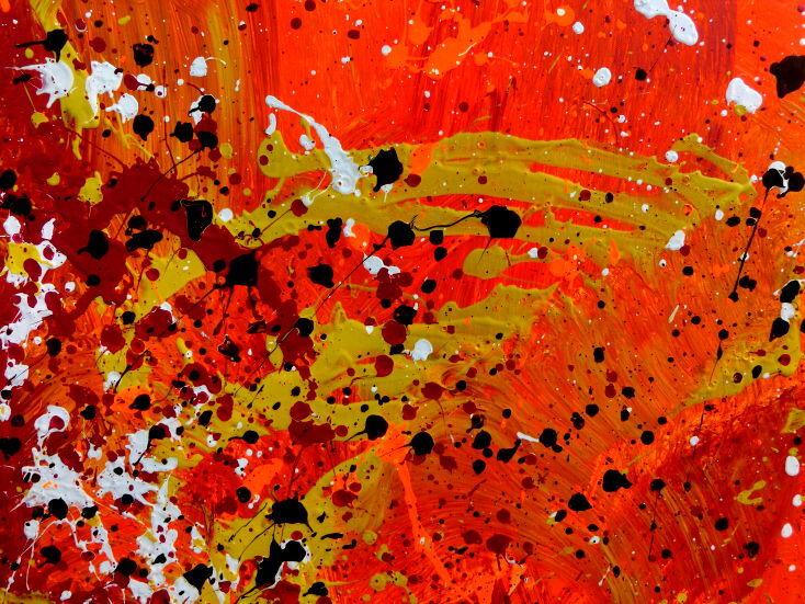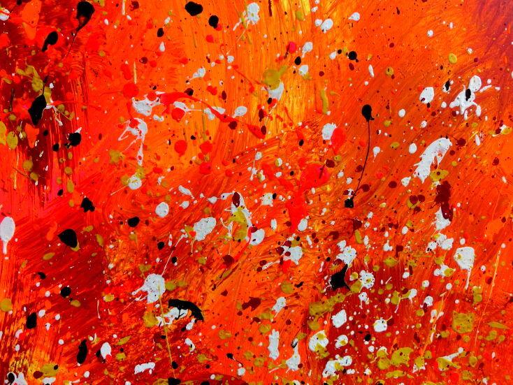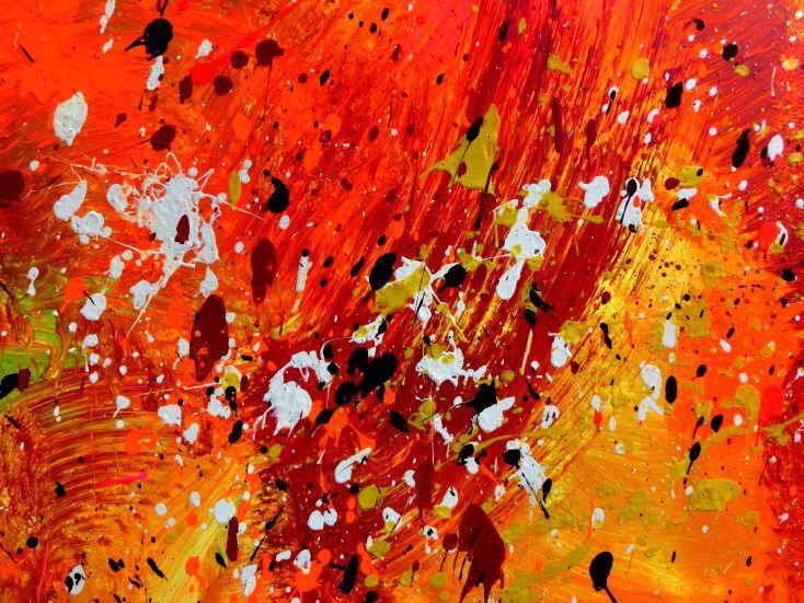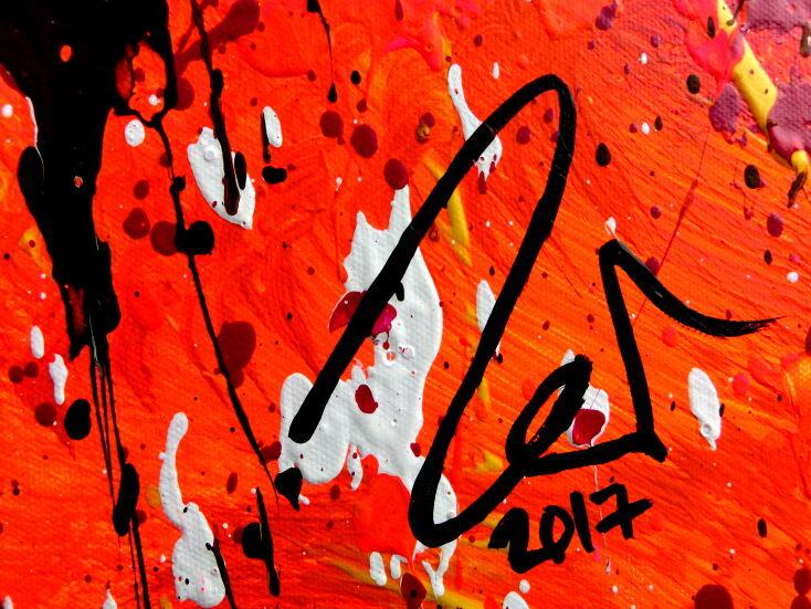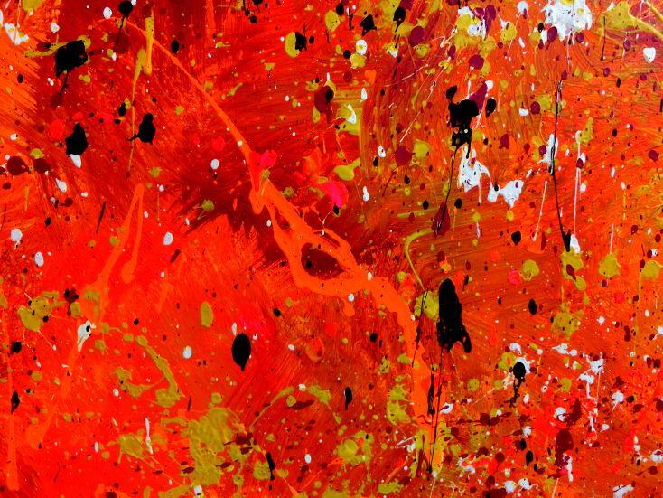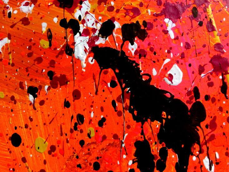 Abstraktes Acrylbild Action painting in Neonfarben orange pink gelb weiß