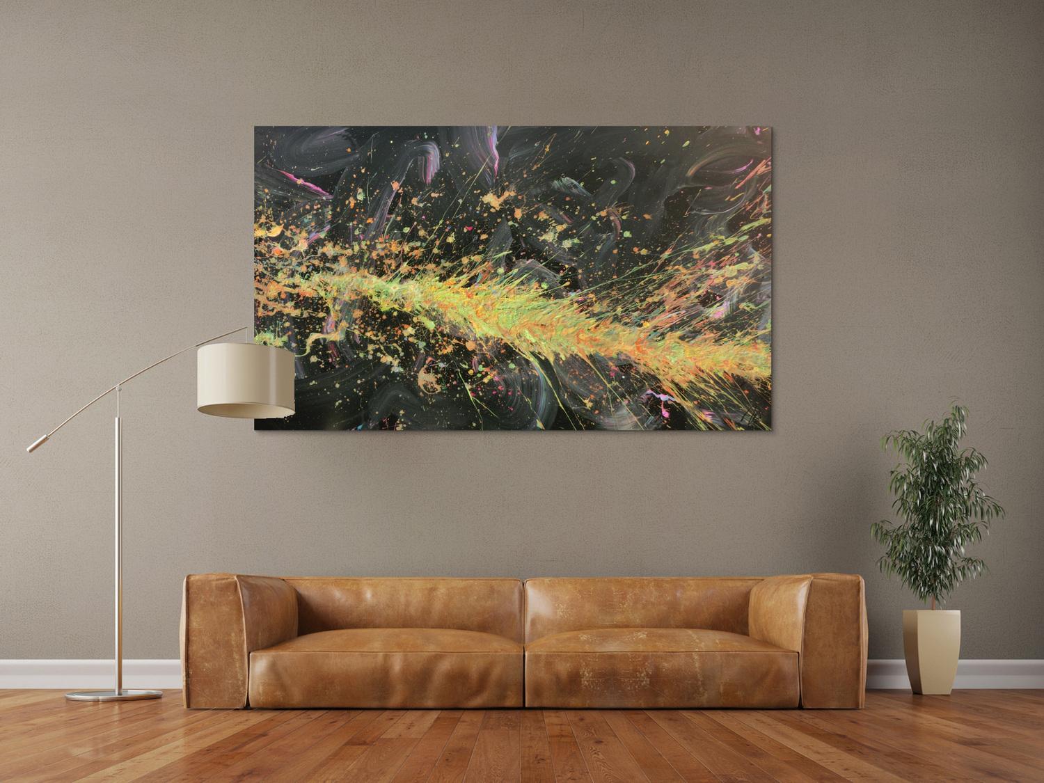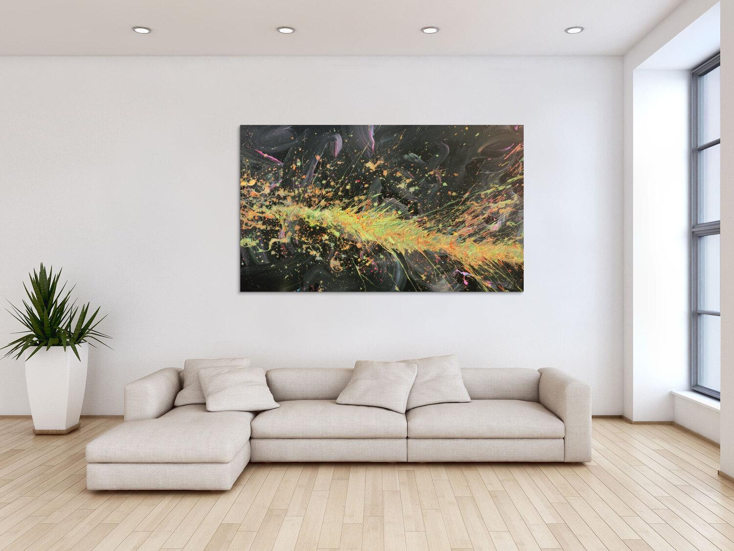Abstraktes Gemälde auf Leinwand Abstraktes Acrylbild Action Painting sehr modern auf dunklem Hintergrund Splash Art in 100x170cm von Alex Zerr
