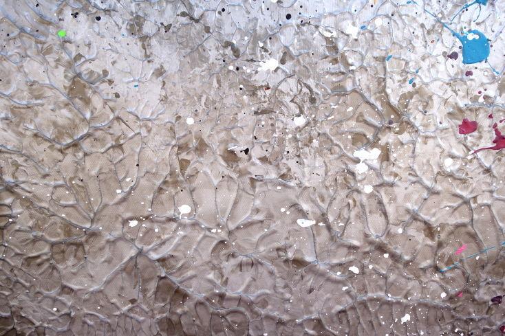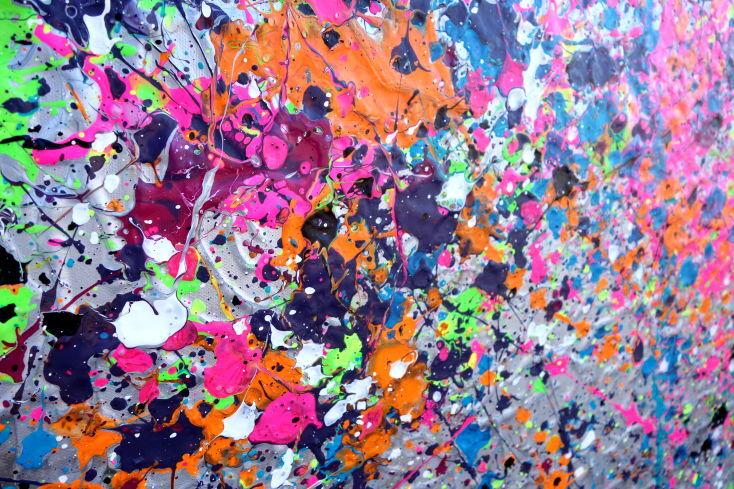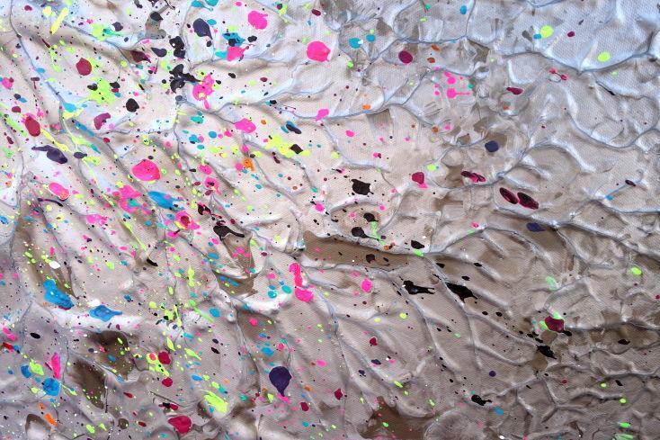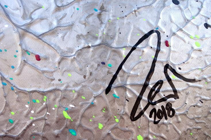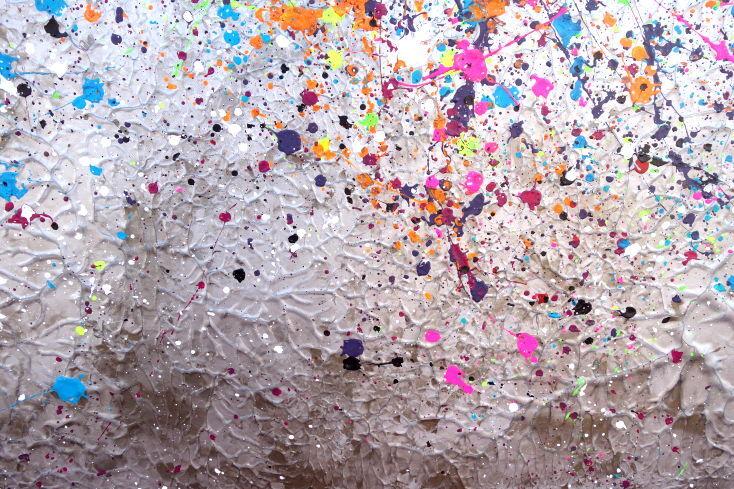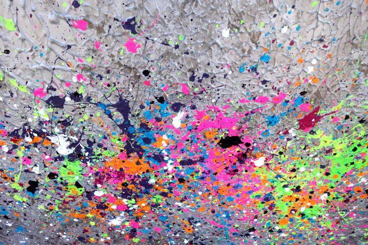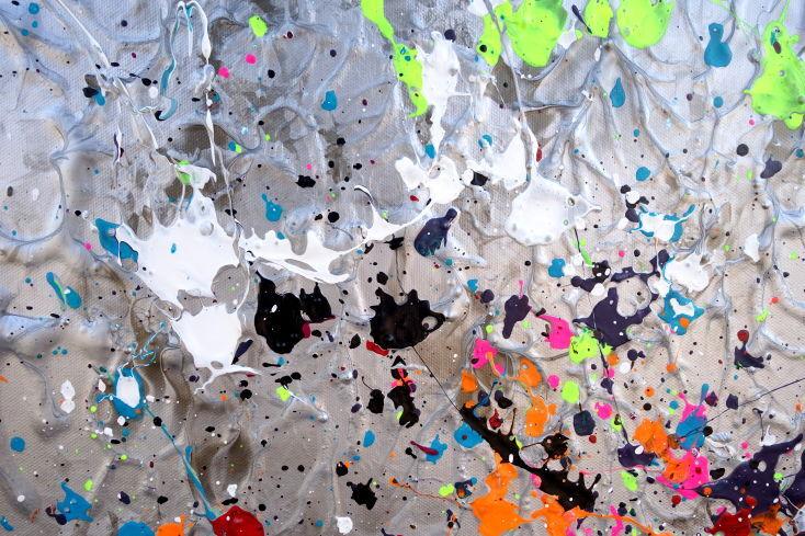 Abstraktes Acrylbild Action Painting silber neon Splash Art bunte Farben auf silber Grund