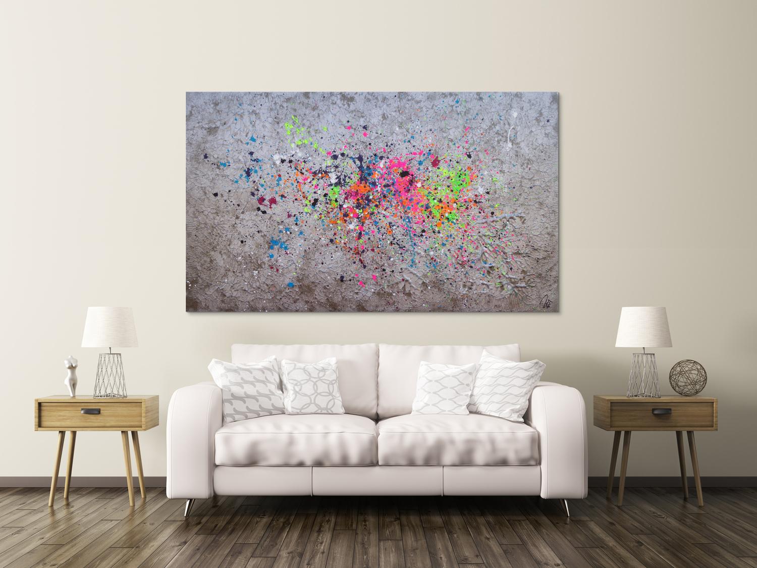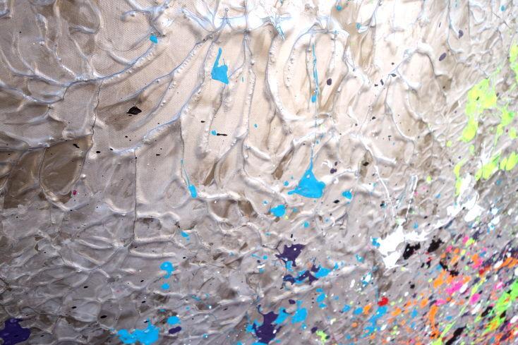 Abstraktes Gemälde auf Leinwand Abstraktes Acrylbild Action Painting silber neon Splash Art bunte Farben auf silber Grund in 120x200cm von Alex Zerr