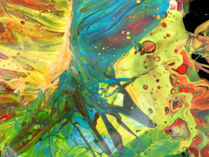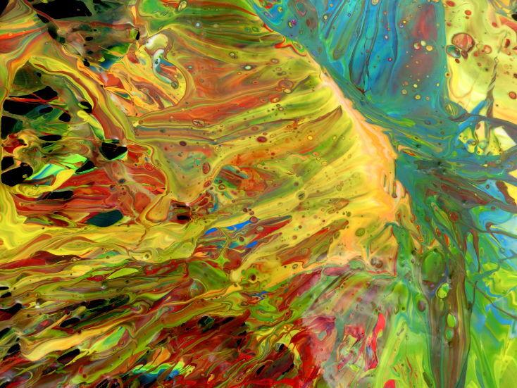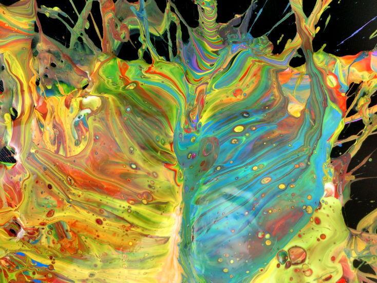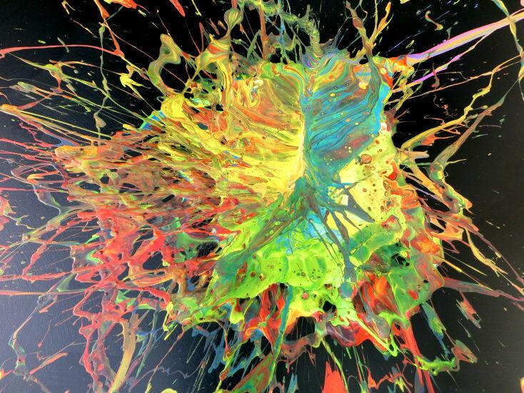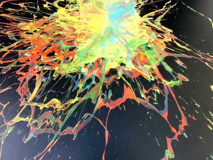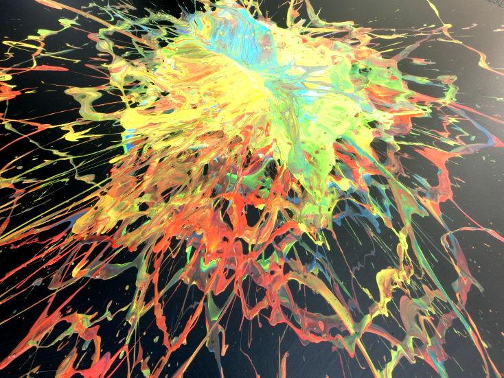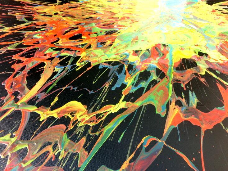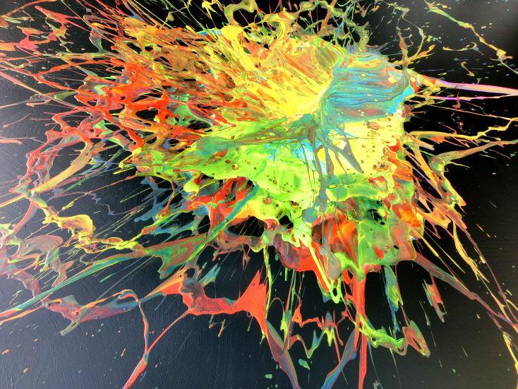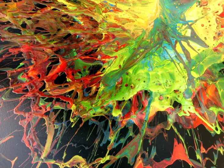Abstraktes Acrylbild Action Painting Splash Art sehr bunt auf schwarzem Hintergrund