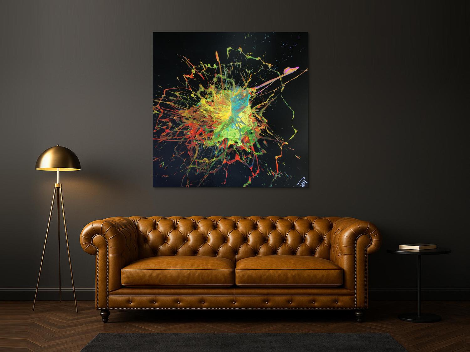 Abstraktes Gemälde auf Leinwand Abstraktes Acrylbild Action Painting Splash Art sehr bunt auf schwarzem Hintergrund in 140x140cm von Alex Zerr
