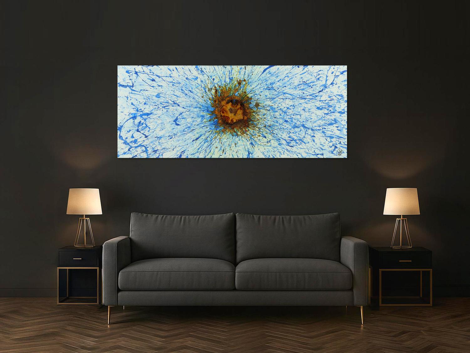 Dieses abstrakte Acrylbild ist ein handgemaltes Original vom Künstler Alex Zerr aus Bad Lisppringe und ist im Jahr 2019 in seinem Atelier entstanden. Das Bild hat eine Größe von 80x200cm und ist bereits auf einem hochwertigen und stabilem Rahmen aufgespannt. Dadurch kann das Bild nach der Lieferung direkt an die Wand gehängt werden und sofort in Ihrem Raum wirken. Alle Seiten des Gemäldes sind passend zum Motiv bemalt, so dass kein zusätzlicher Rahmen benötigt wird.