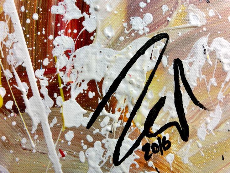 Dieses abstrakte Acrylbild ist ein handgemaltes Original vom Künstler Alex Zerr aus Bad Lisppringe und ist im Jahr 2016 in seinem Atelier entstanden. Das Bild hat eine Größe von 100x150cm und ist bereits auf einem hochwertigen und stabilem Rahmen aufgespannt. Dadurch kann das Bild nach der Lieferung direkt an die Wand gehängt werden und sofort in Ihrem Raum wirken. Alle Seiten des Gemäldes sind passend zum Motiv bemalt, so dass kein zusätzlicher Rahmen benötigt wird.
