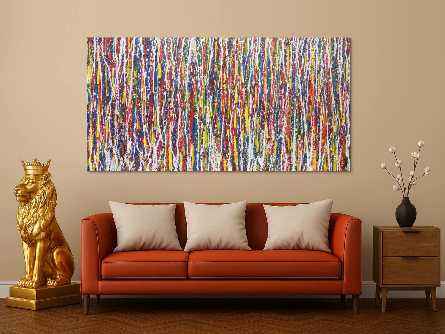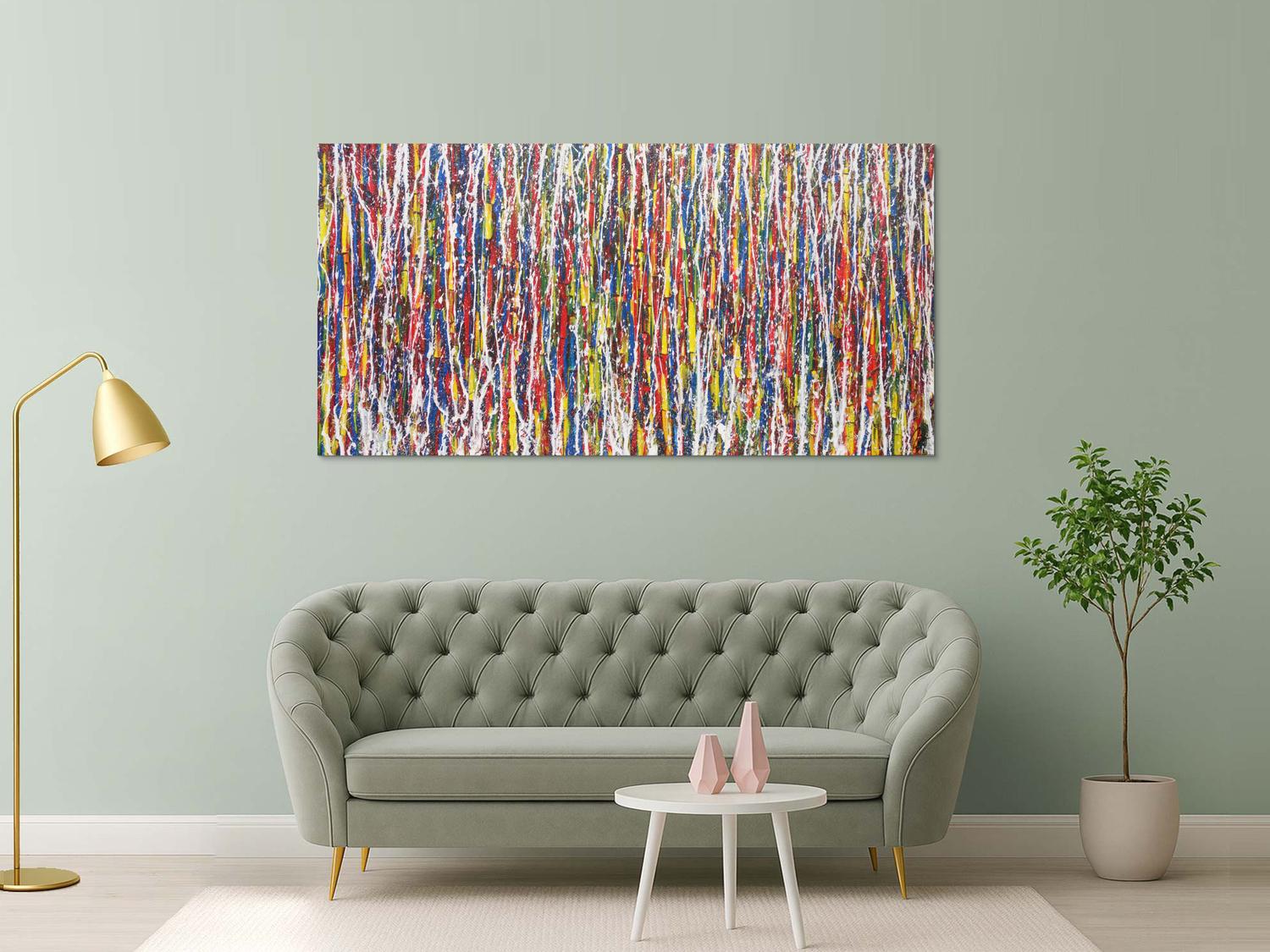 Abstraktes Gemälde auf Leinwand Abstraktes Acrylbild bunt weiße Streifen modern expressionistisch Action Painting in 100x200cm von Alex Zerr