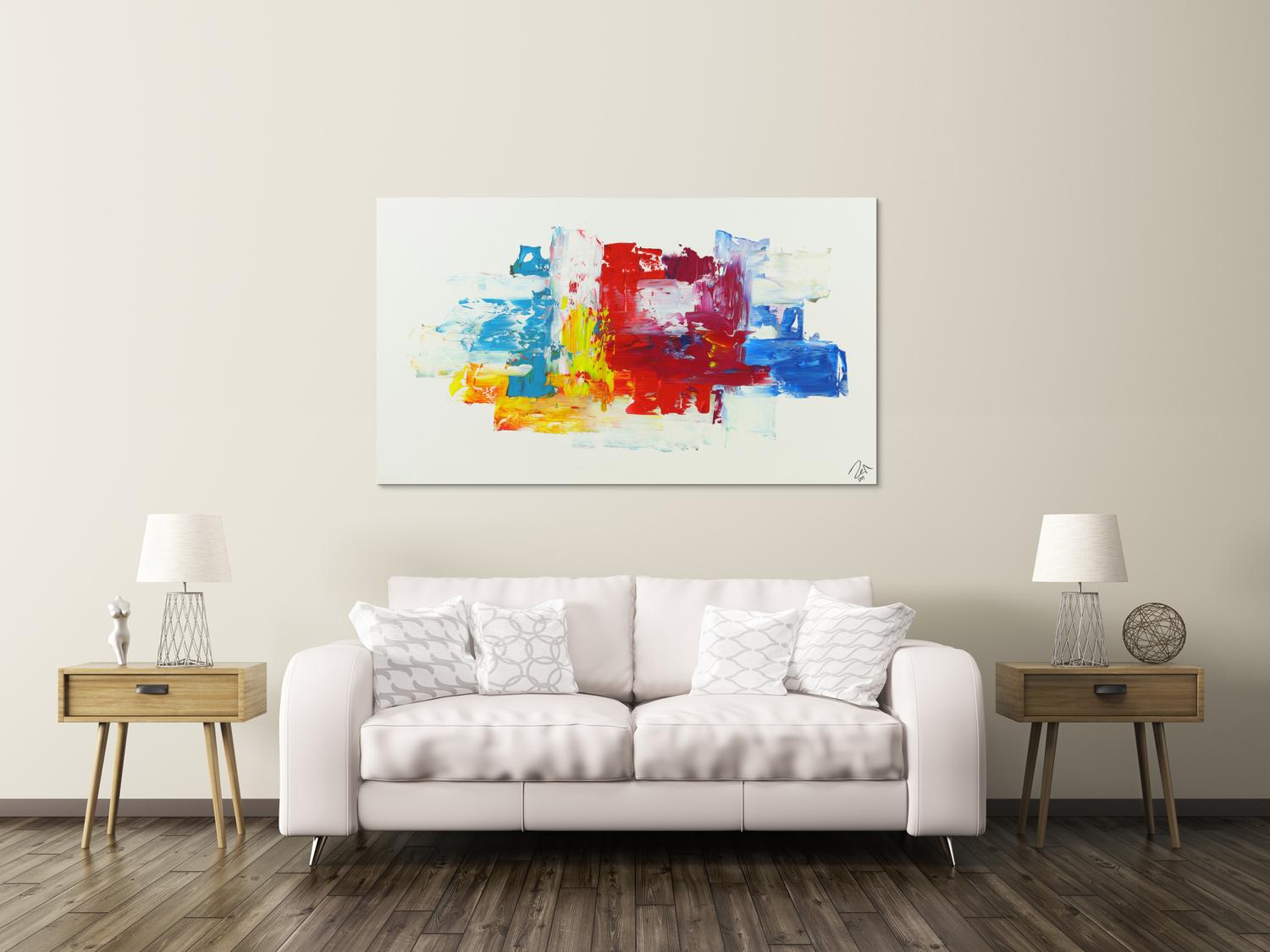 Abstraktes Gemälde auf Leinwand Abstraktes Acrylbild bunte Farben auf weißem Grund Spachteltechnik modern abstrakt expressionistisch in 90x160cm von Alex Zerr