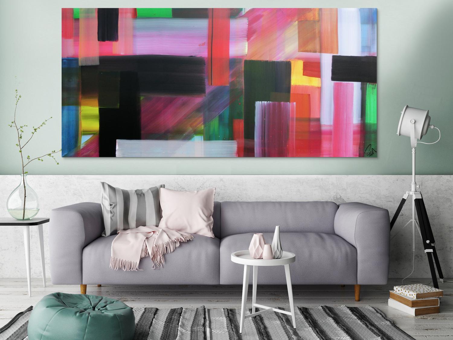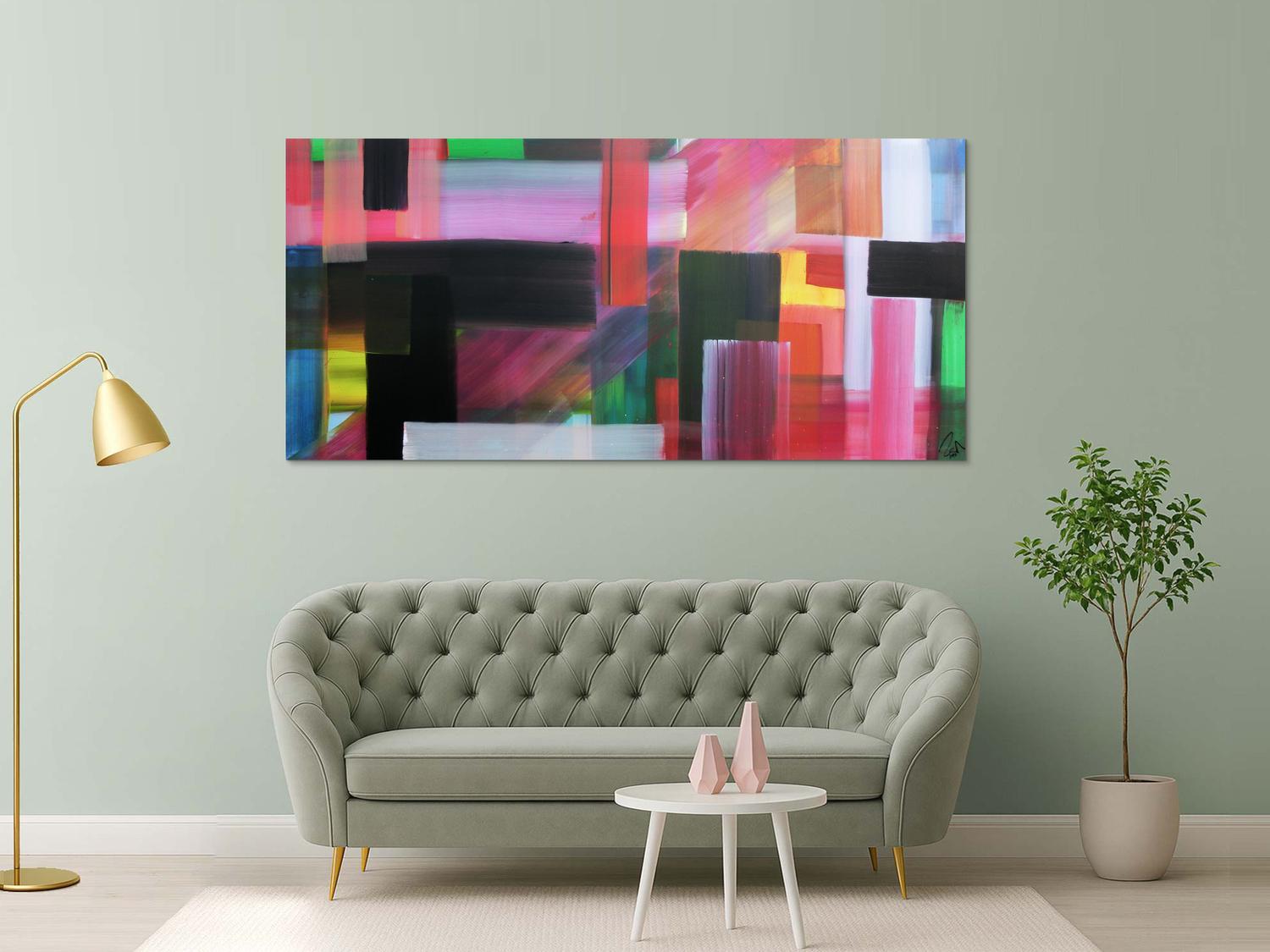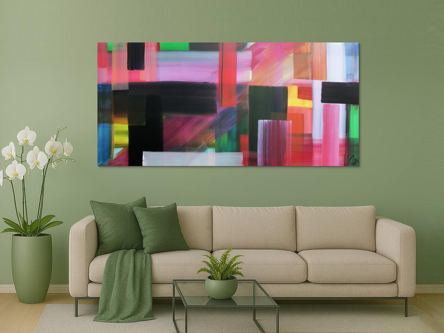 Abstraktes Gemälde auf Leinwand Abstraktes Acrylbild bunte Streifen sehr modern viele Farben hell und dunkel zeitgenössisch in 110x220cm von Alex Zerr