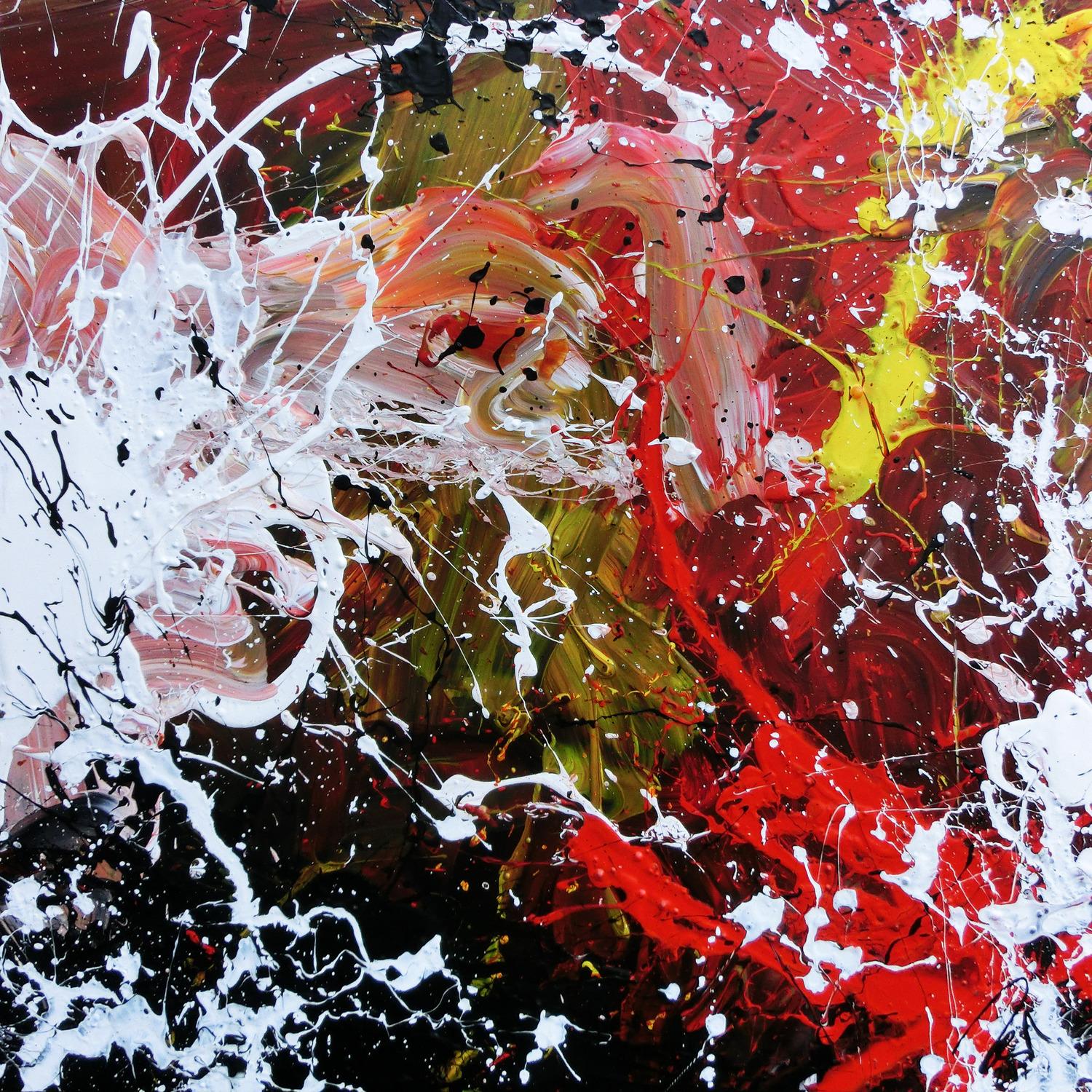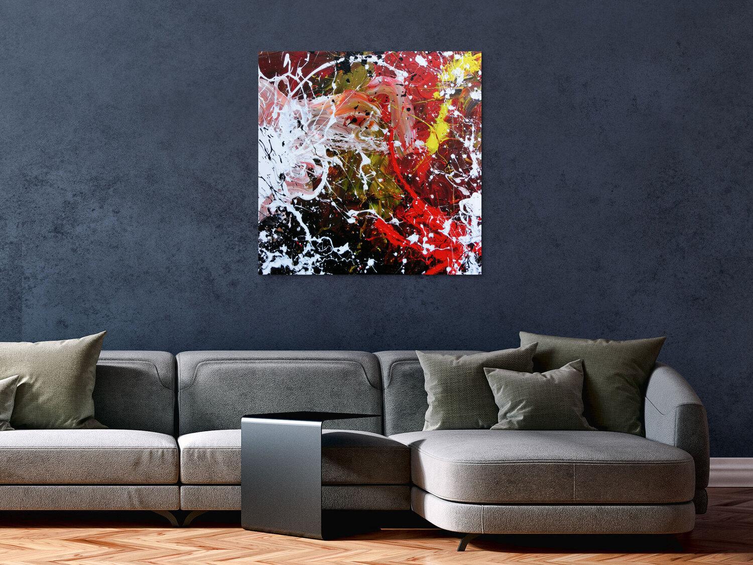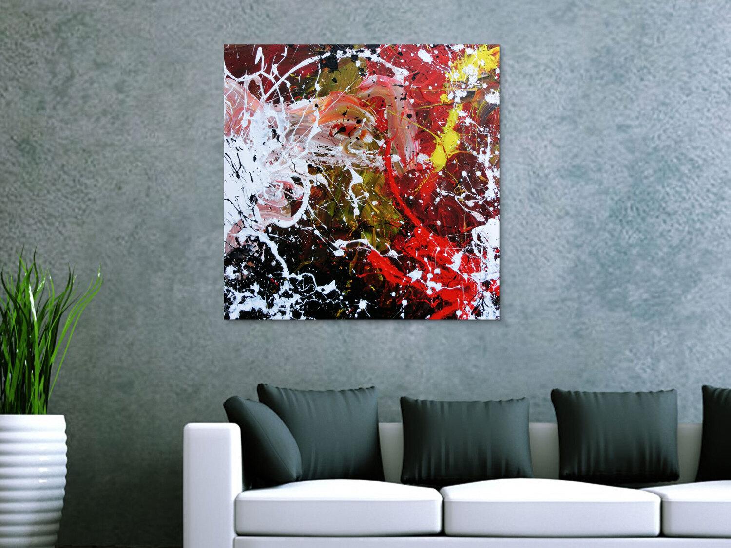 Abstraktes Gemälde auf Leinwand Abstraktes Acrylbild handgemalt modern Action Painting weiß rot gelb schwarz in 80x80cm von Alex Zerr