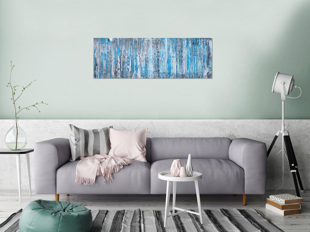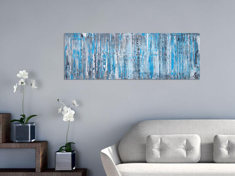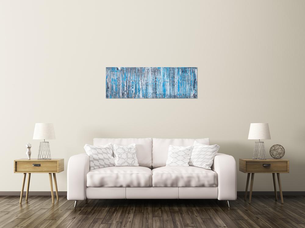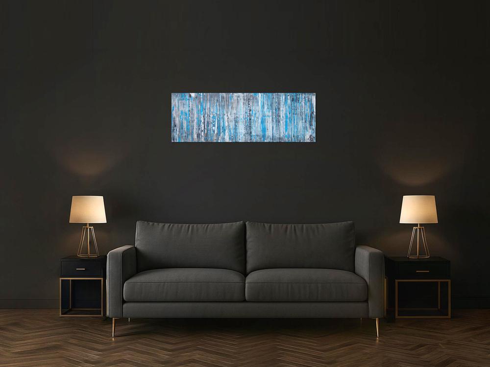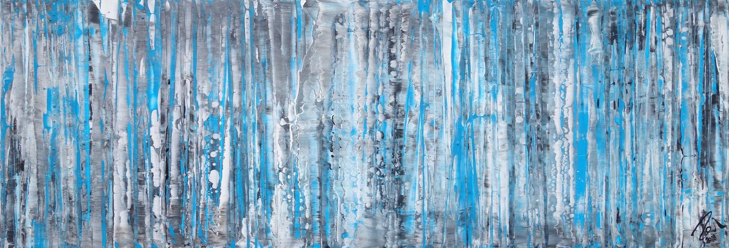 Dieses abstrakte Acrylbild ist ein handgemaltes Original vom Künstler Alex Zerr aus Bad Lisppringe und ist im Jahr 2018 in seinem Atelier entstanden. Das Bild hat eine Größe von 40x120cm und ist bereits auf einem hochwertigen und stabilem Rahmen aufgespannt. Dadurch kann das Bild nach der Lieferung direkt an die Wand gehängt werden und sofort in Ihrem Raum wirken. Alle Seiten des Gemäldes sind passend zum Motiv bemalt, so dass kein zusätzlicher Rahmen benötigt wird.