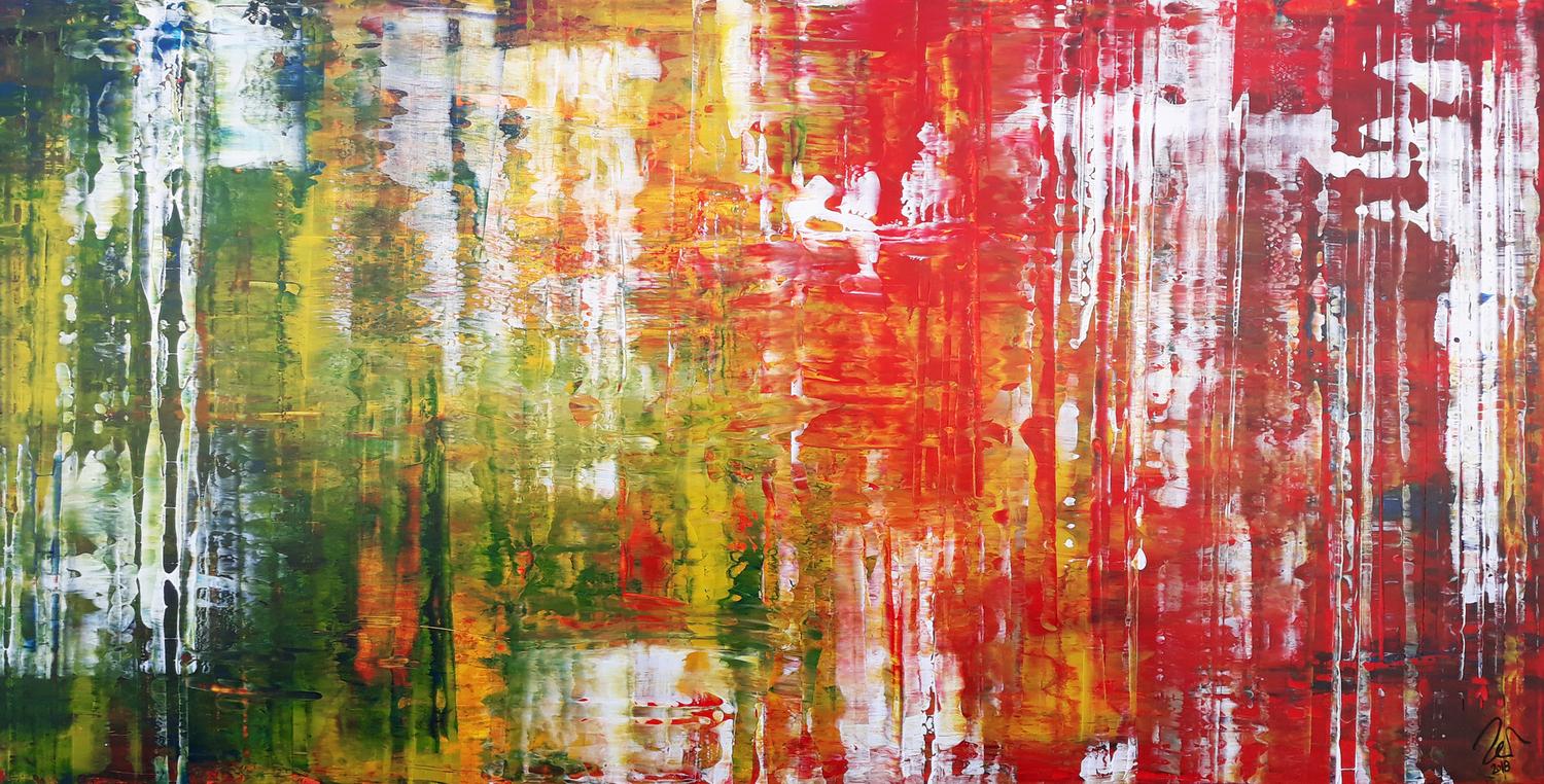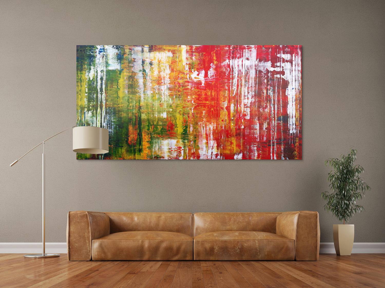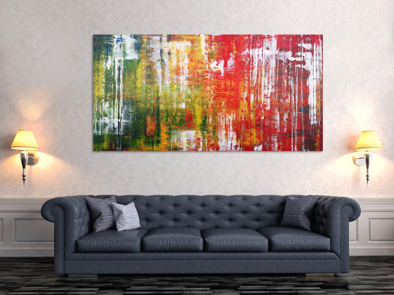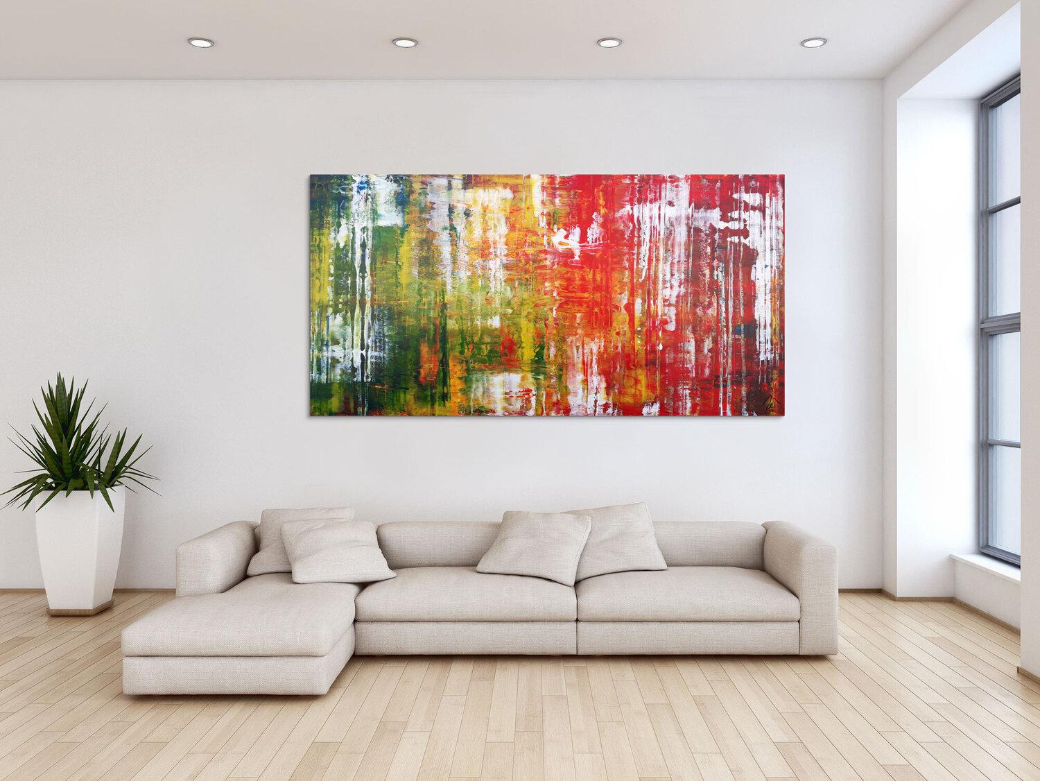Abstraktes Gemälde auf Leinwand Abstraktes Acrylbild in Spachteltechnik sehr modern und bunt viele Farben rot gelb grün blau weiß in 100x200cm von Alex Zerr