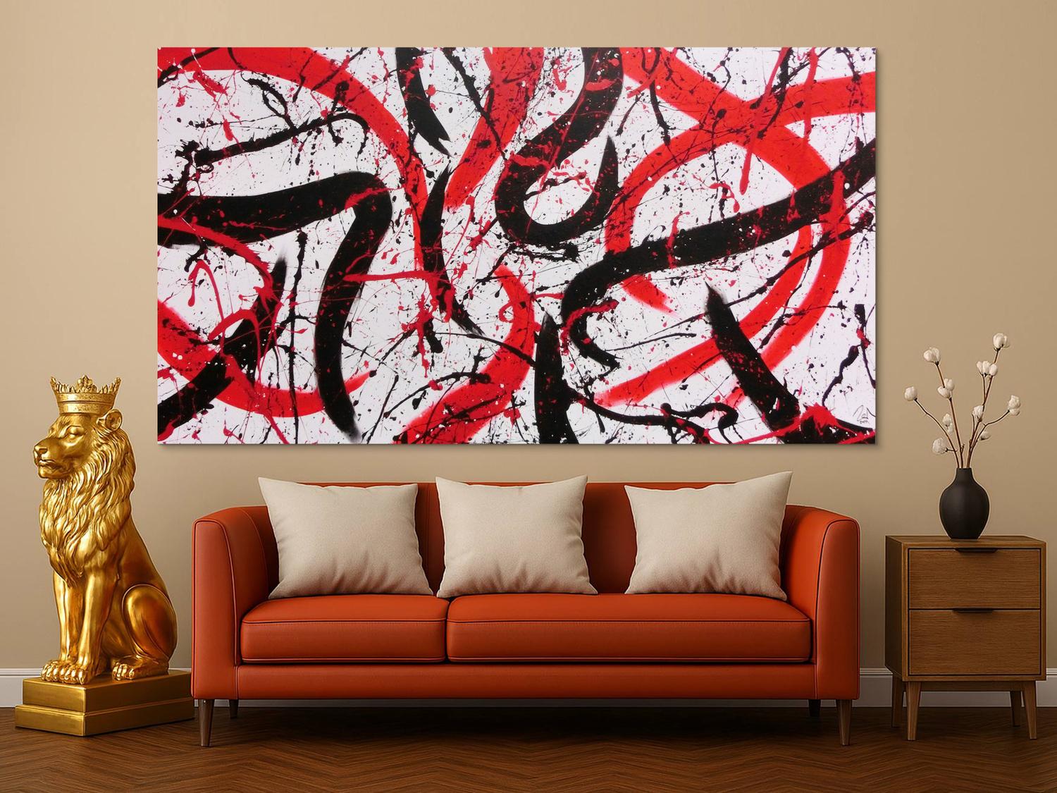 Abstraktes Gemälde auf Leinwand Abstraktes Acrylbild in weiß mit schwarz und rot Action Paitning sehr modern zeitgenössisch in 130x230cm von Alex Zerr