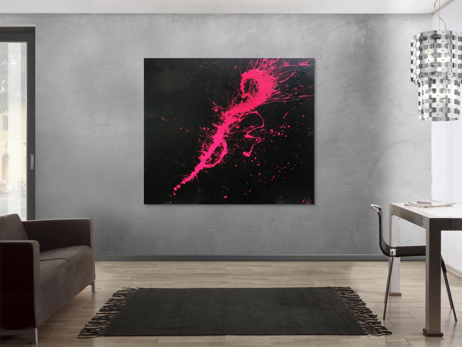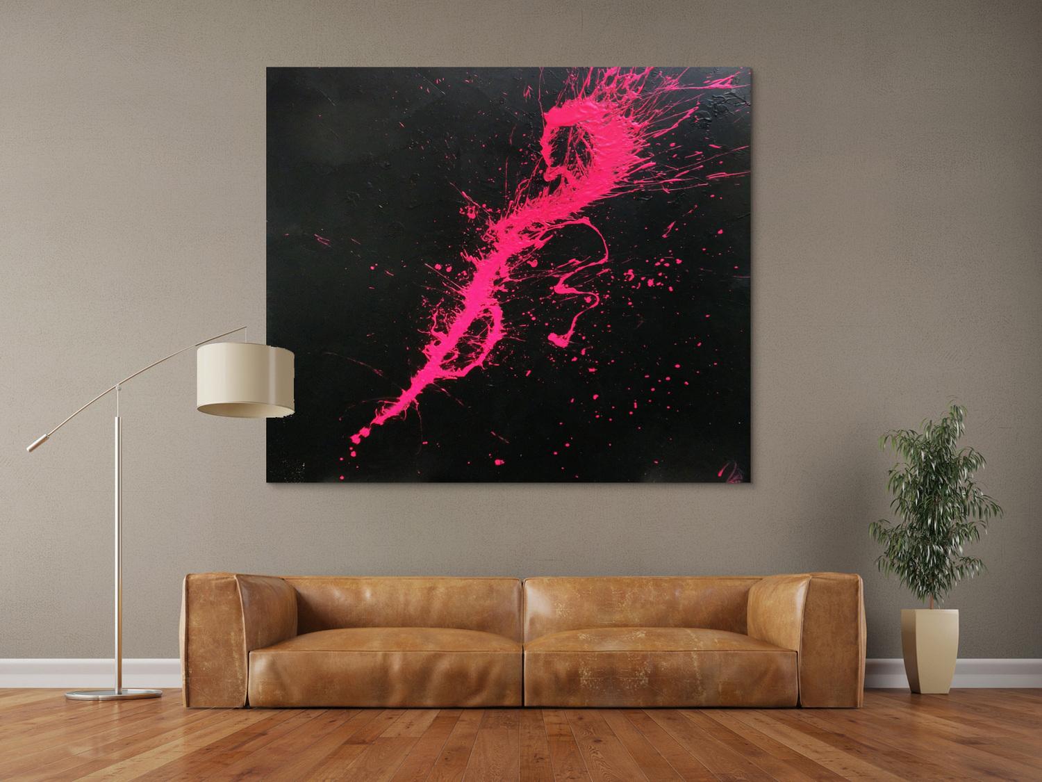 Abstraktes Gemälde auf Leinwand Abstraktes Acrylbild Minimalistisch sehr modern schwarz und pink Action Painting Splash Art in 140x120cm von Alex Zerr
