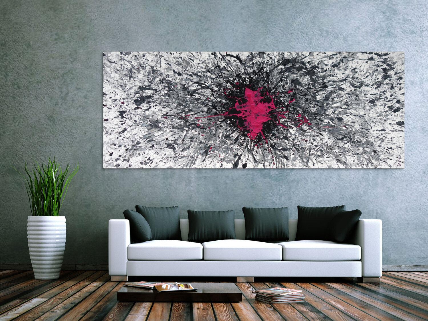 Abstraktes Gemälde auf Leinwand Abstraktes Acrylbild Mischtechnik Action Painting Splash Art grau weiß scharz pink Modern Art in 100x250cm von Alex Zerr
