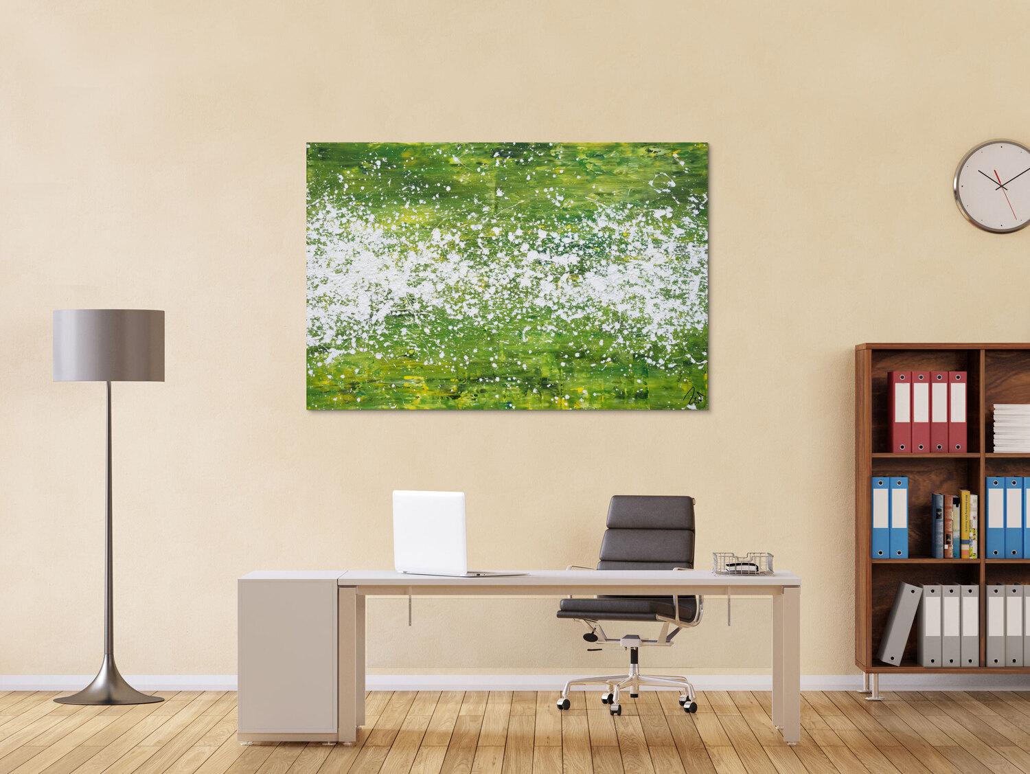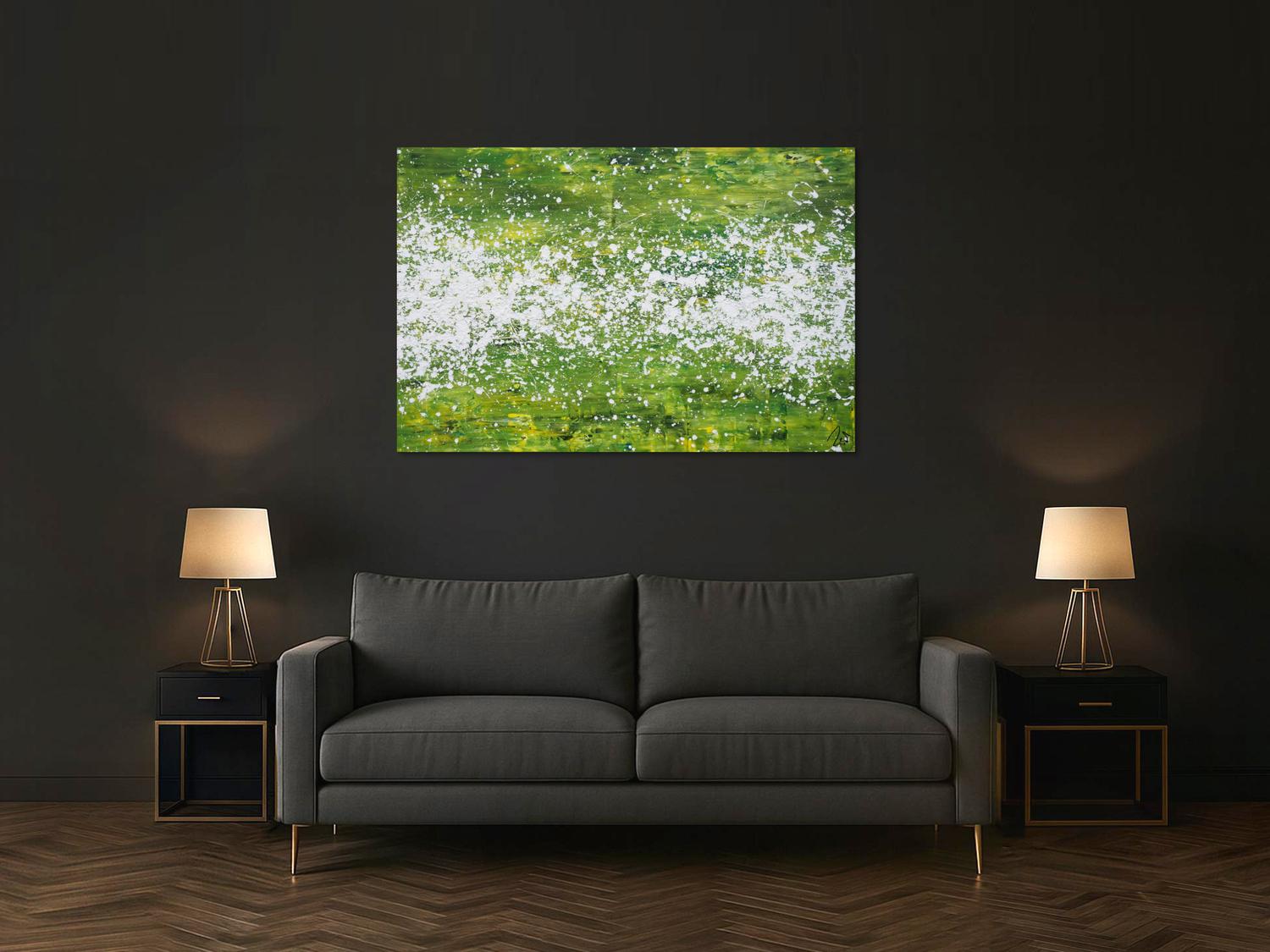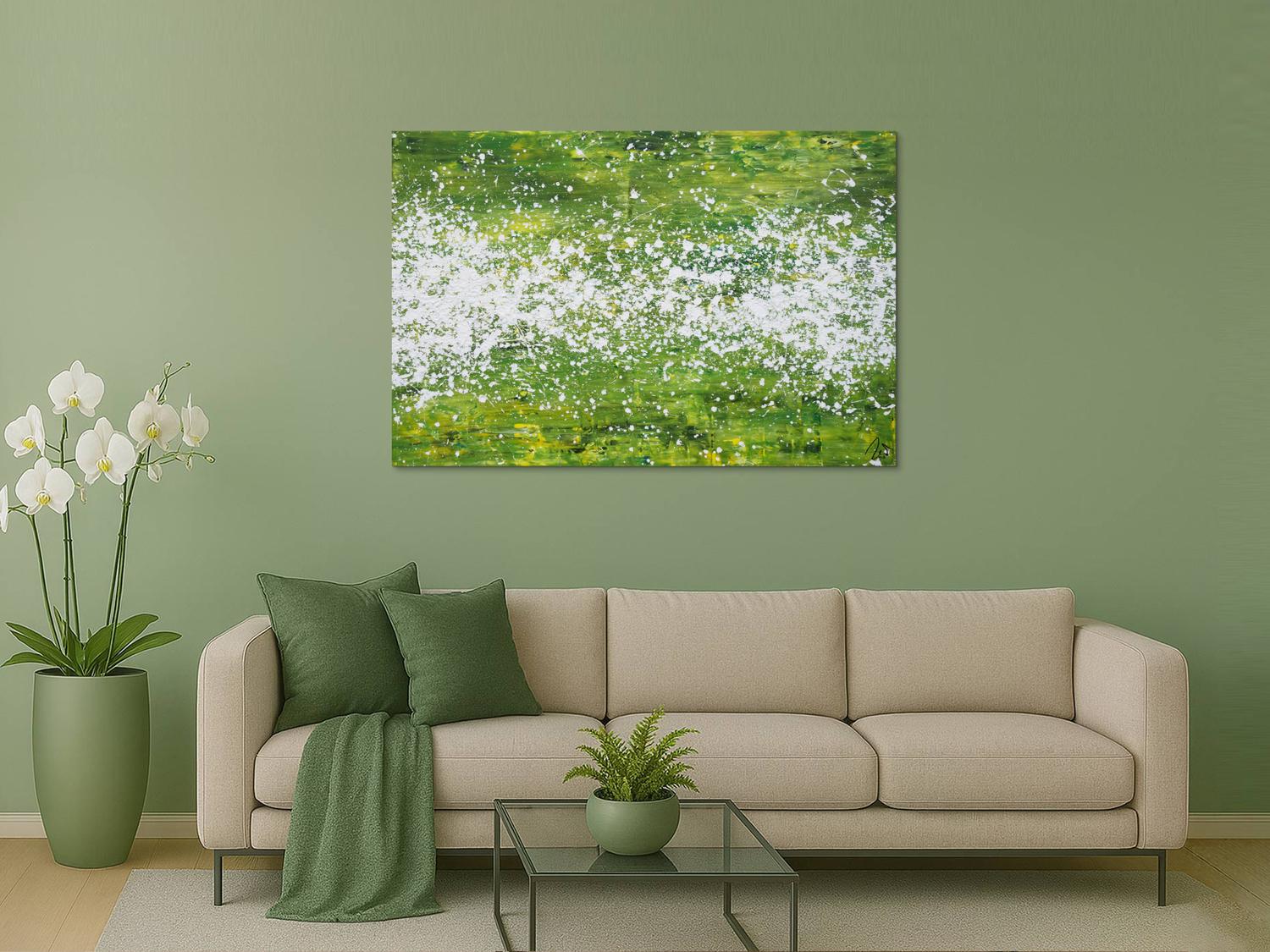 Abstraktes Acrylbild modern grün weiß Action Paintng Modern Art zeitgenössisch