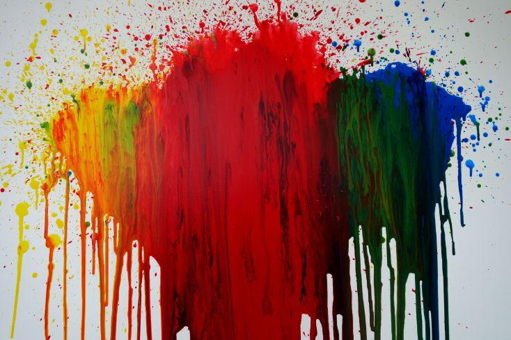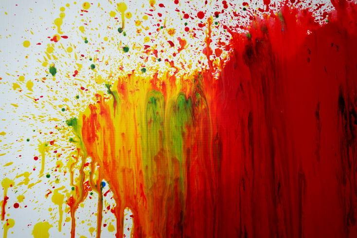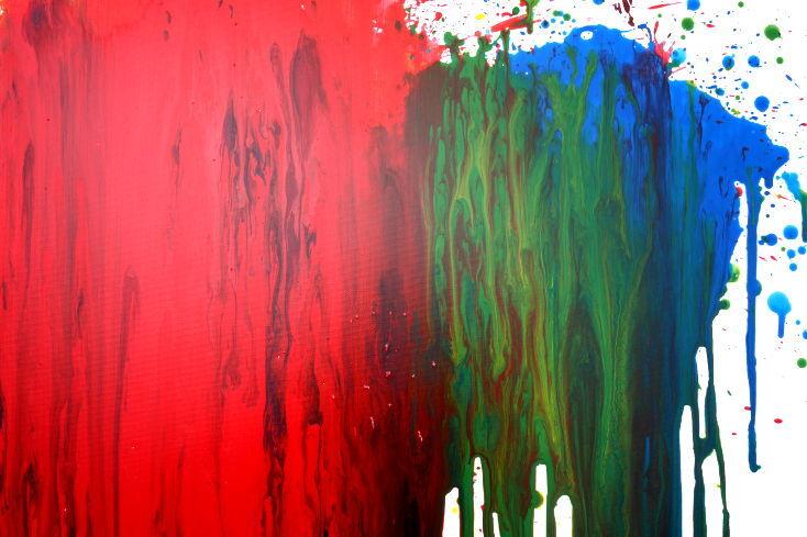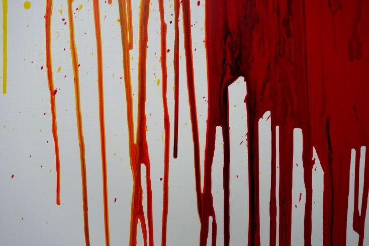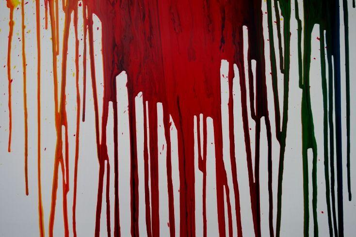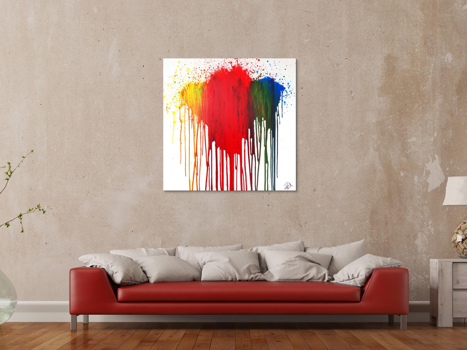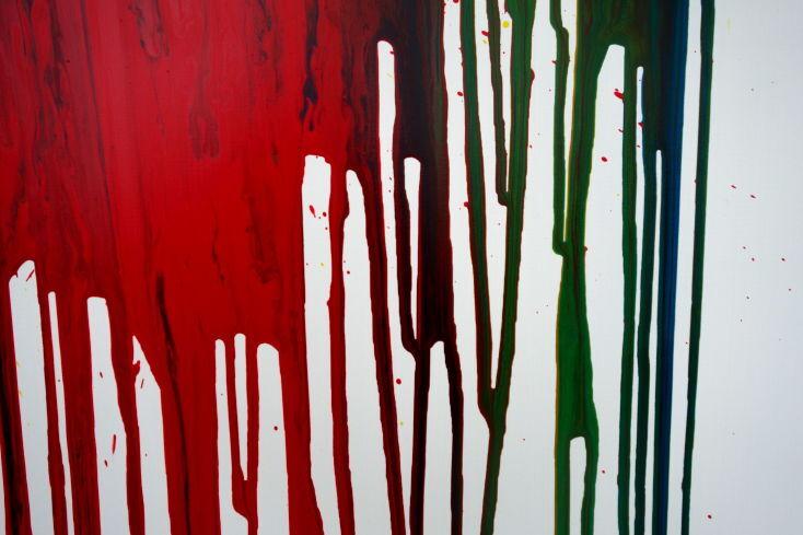 Abstraktes Acrylbild modern in fließtechnis rot gelb grün blau auf weiß zeitgenössisch