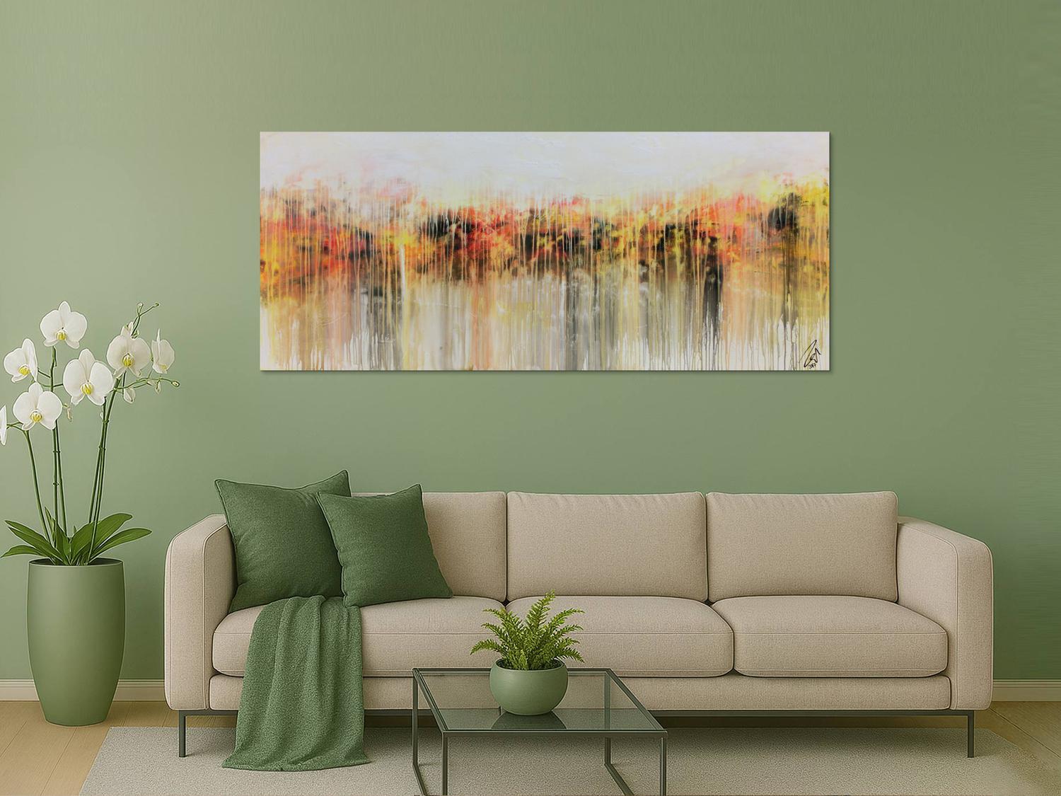 Abstraktes Gemälde auf Leinwand Abstraktes Acrylbild modern in hellen Farben Fließtechnik weiß gelb rot grau in 80x200cm von Alex Zerr