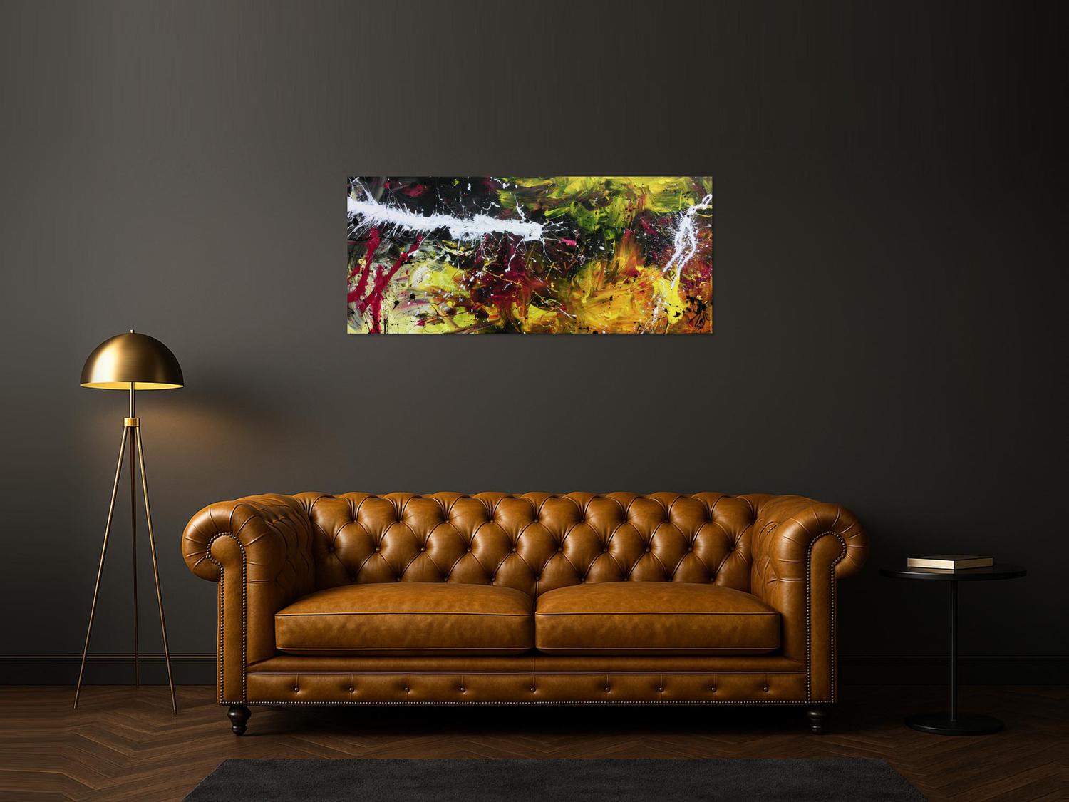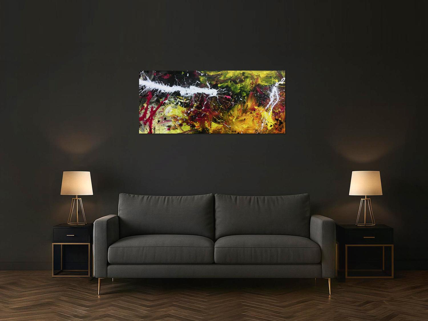 Dieses abstrakte Acrylbild ist ein handgemaltes Original vom Künstler Alex Zerr aus Bad Lisppringe und ist im Jahr 2016 in seinem Atelier entstanden. Das Bild hat eine Größe von 60x140cm und ist bereits auf einem hochwertigen und stabilem Rahmen aufgespannt. Dadurch kann das Bild nach der Lieferung direkt an die Wand gehängt werden und sofort in Ihrem Raum wirken. Alle Seiten des Gemäldes sind passend zum Motiv bemalt, so dass kein zusätzlicher Rahmen benötigt wird.