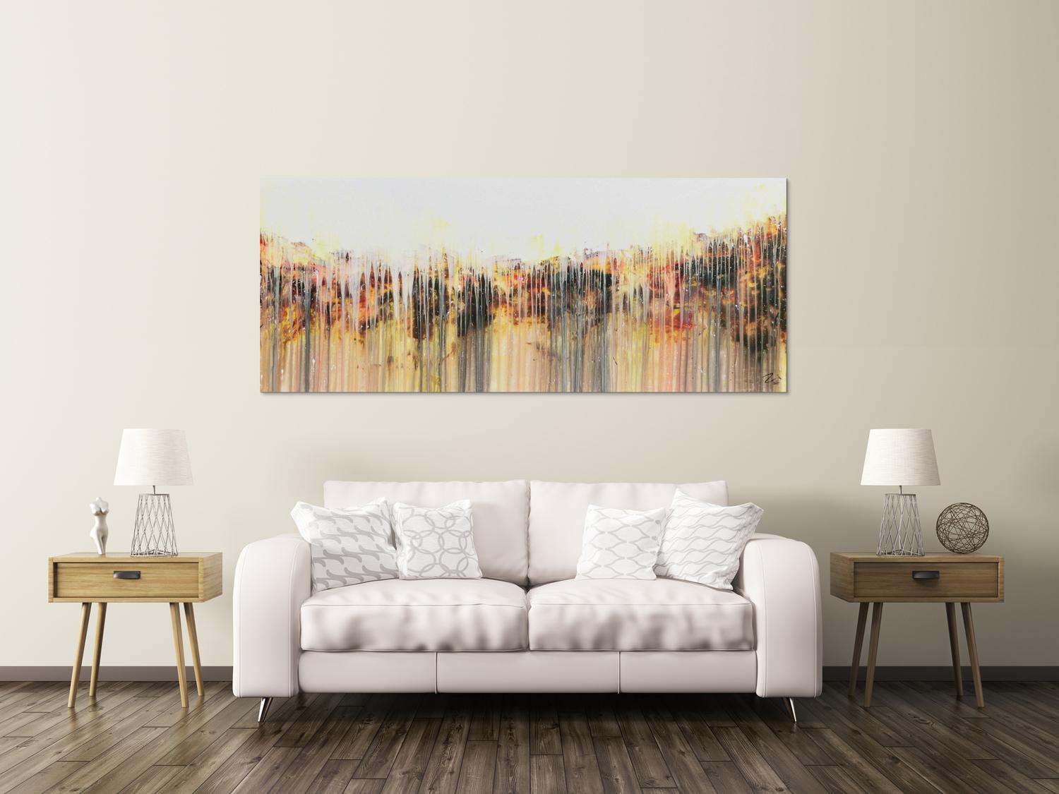 Dieses abstrakte Acrylbild ist ein handgemaltes Original vom Künstler Alex Zerr aus Bad Lisppringe und ist im Jahr 2015 in seinem Atelier entstanden. Das Bild hat eine Größe von 80x200cm und ist bereits auf einem hochwertigen und stabilem Rahmen aufgespannt. Dadurch kann das Bild nach der Lieferung direkt an die Wand gehängt werden und sofort in Ihrem Raum wirken. Alle Seiten des Gemäldes sind passend zum Motiv bemalt, so dass kein zusätzlicher Rahmen benötigt wird.