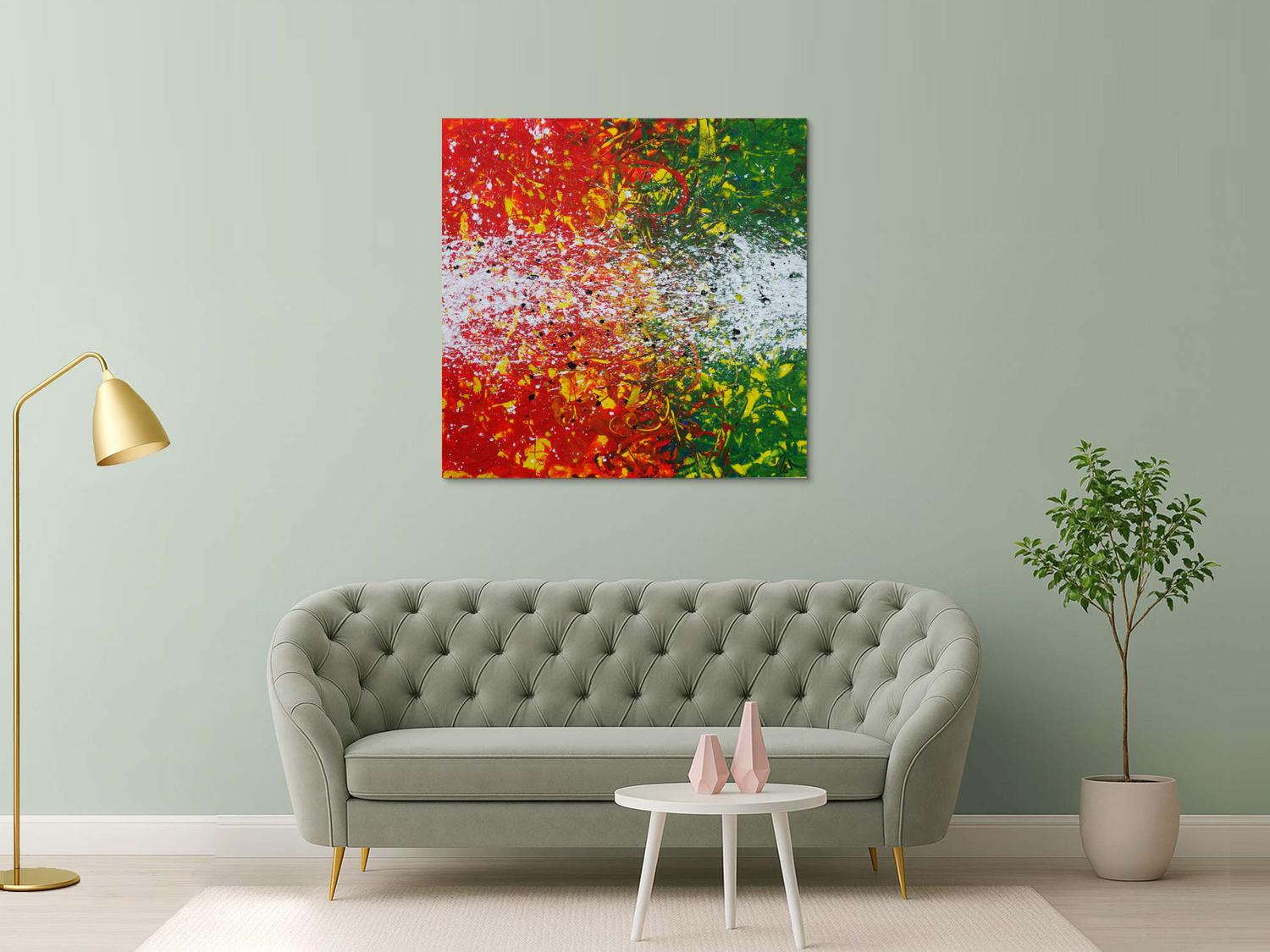 Abstraktes Acrylbild modernes Gemälde orange grün weiß quadratisch Action Painting