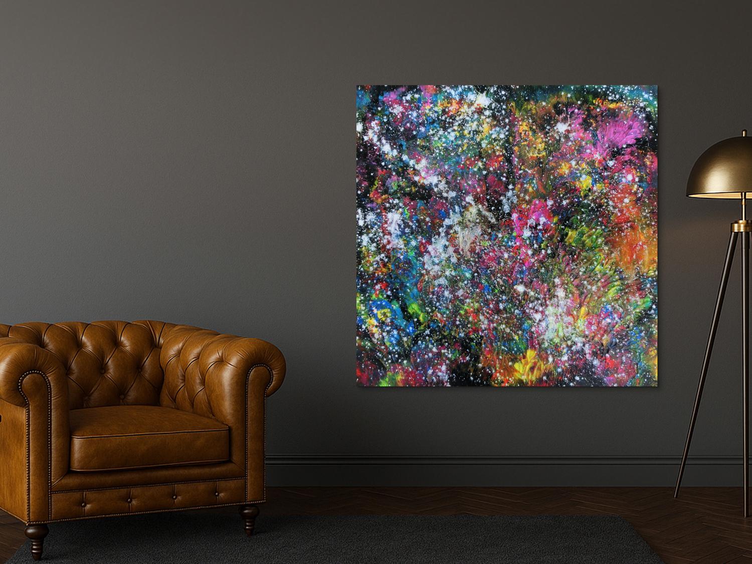 Abstraktes Gemälde auf Leinwand Abstraktes Acrylbild modernes Gemälde sehr bunt dunkel zeitgenössisch Mischtechnik in 130x130cm von Alex Zerr