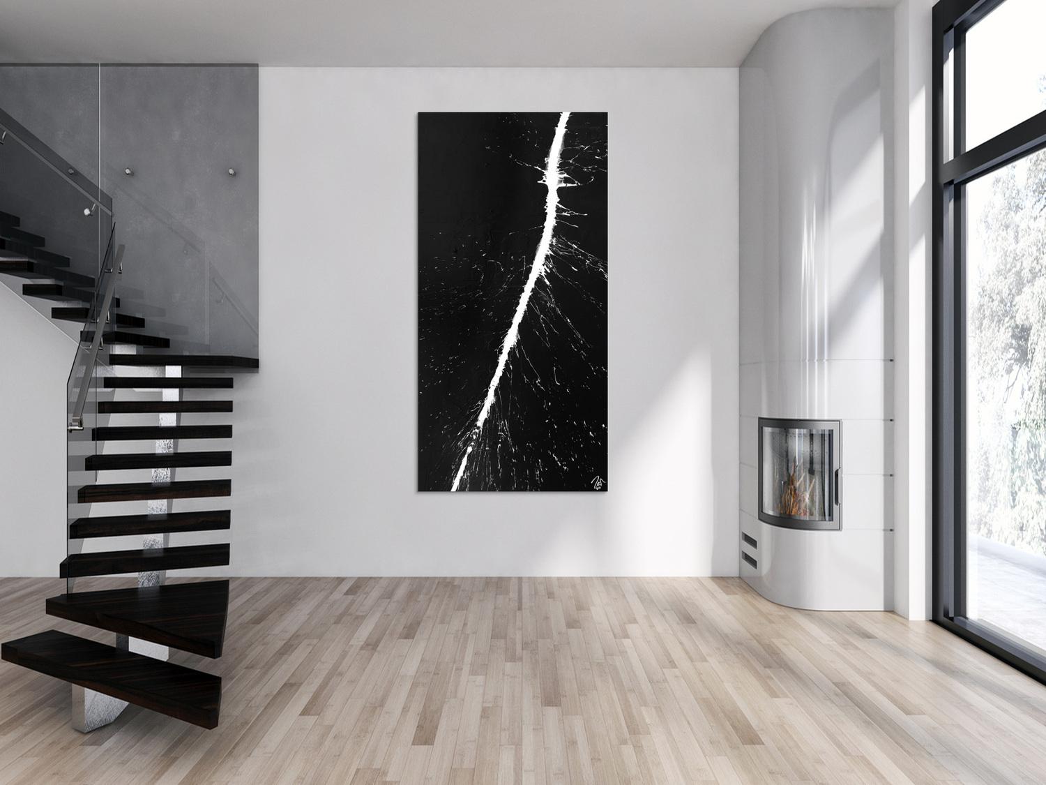 Abstraktes Gemälde auf Leinwand Abstraktes Acrylbild schwarz weiß Action Painting sehr modern minimalistisch zeitgenössisch in 200x100cm von Alex Zerr