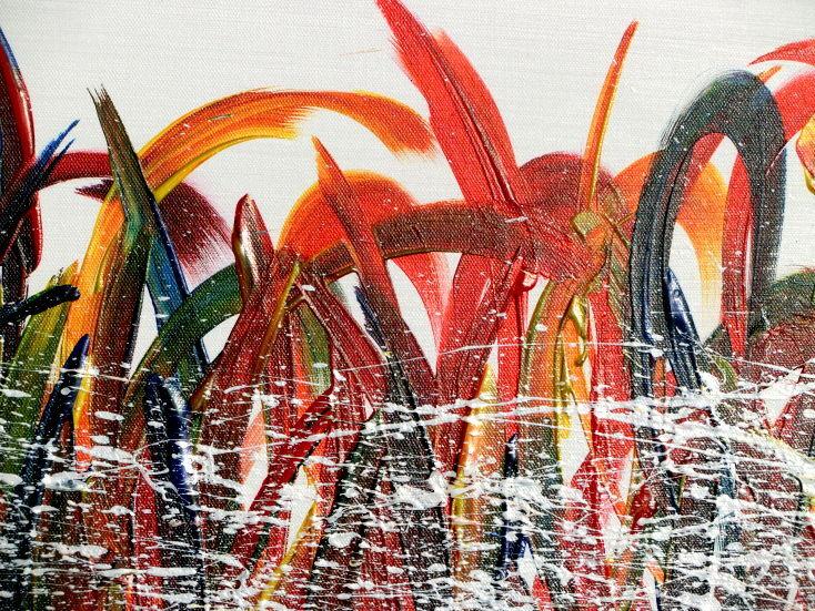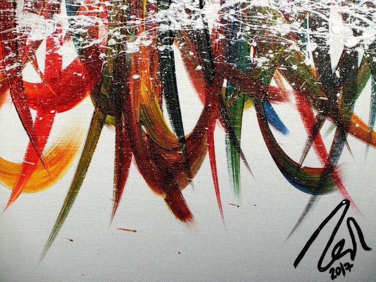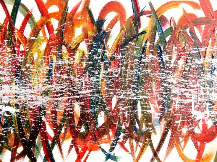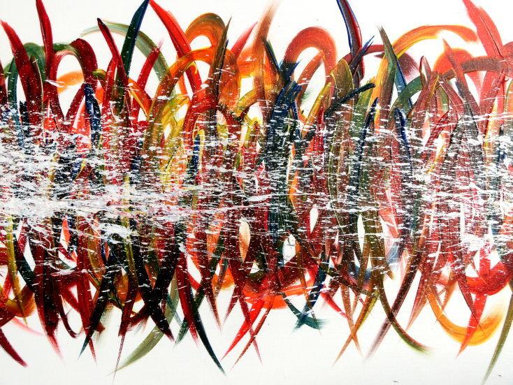 Abstraktes Acrylbild sehr bunt farbenfroh moderne Schleifen und Haken Action Painting