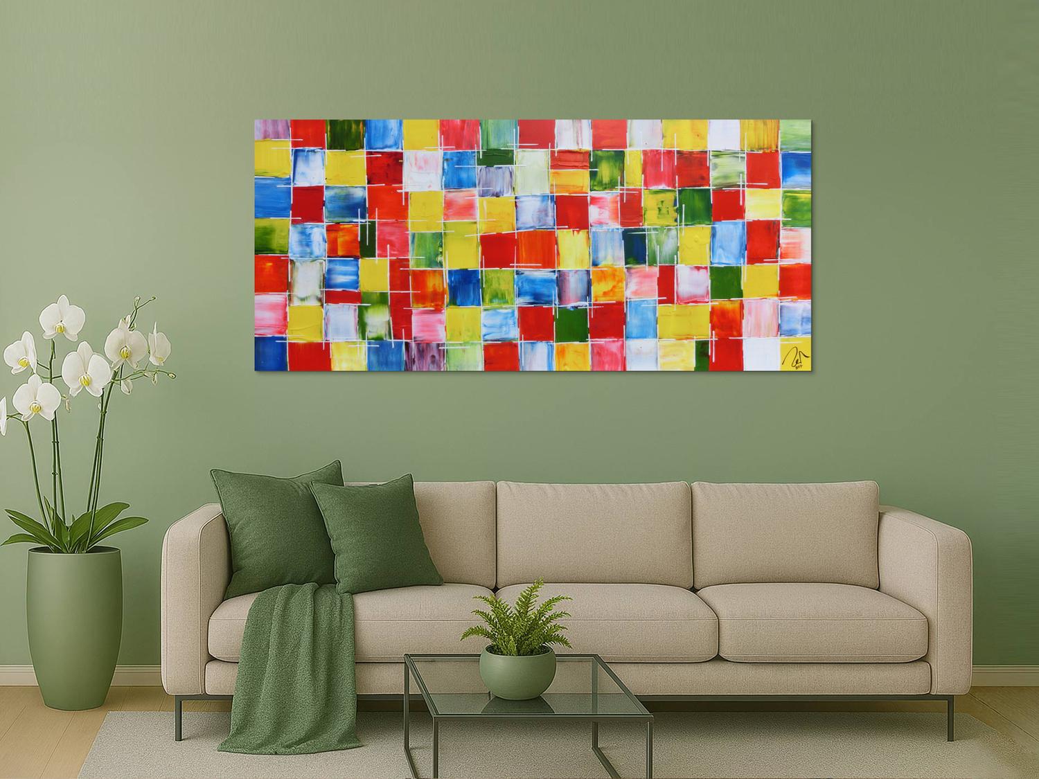 Abstraktes Gemälde auf Leinwand Abstraktes Acrylbild sehr bunt farbige Kacheln bunte Flächen modern und zeitgenössisch in 90x200cm von Alex Zerr