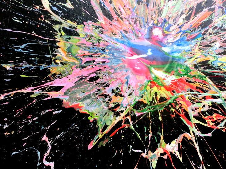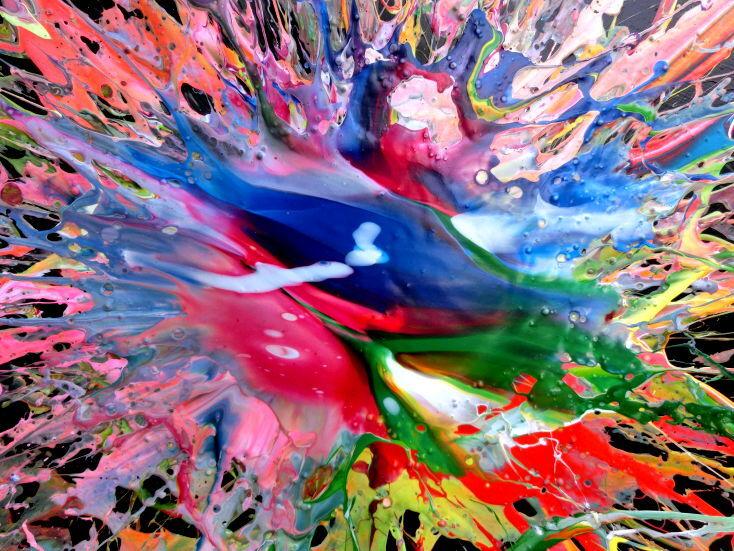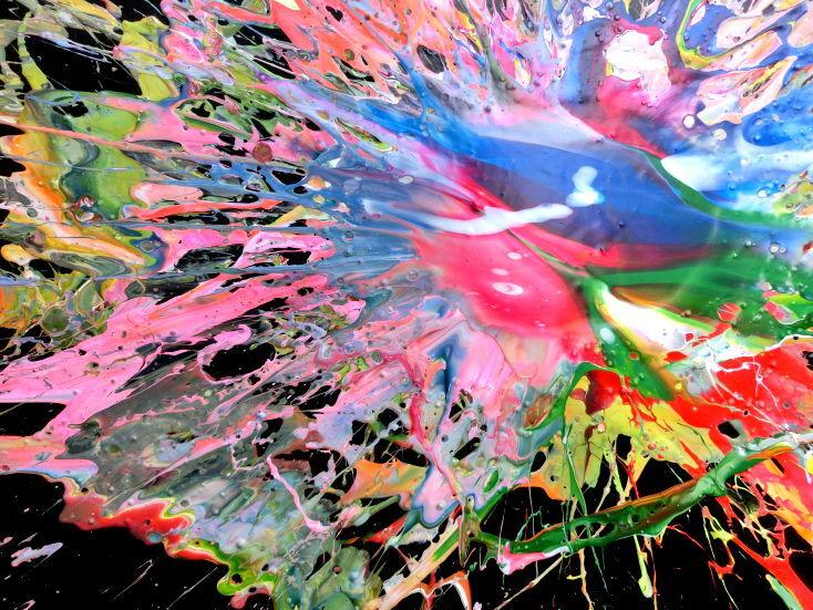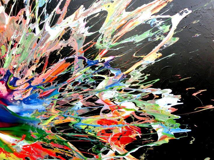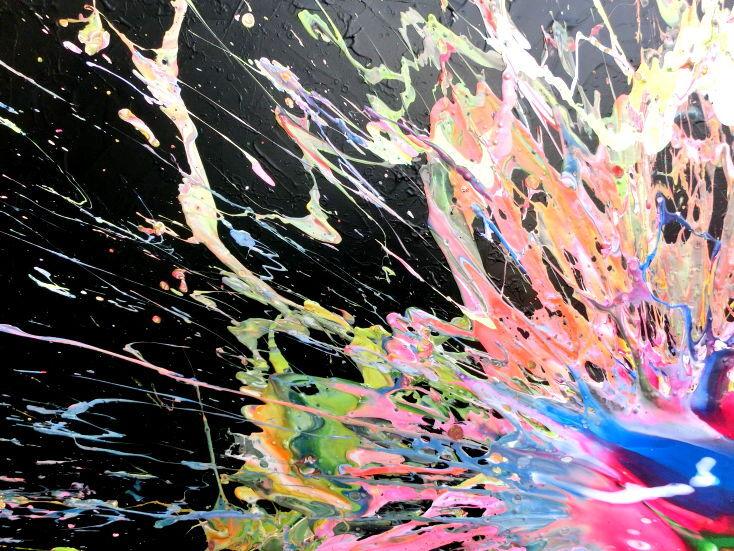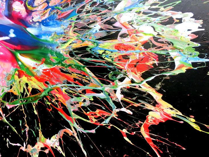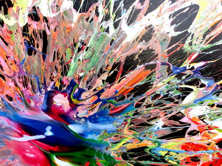 Abstraktes Acrylbild sehr bunt modern Action Painting Splash Art viele Farben bunter Fleck