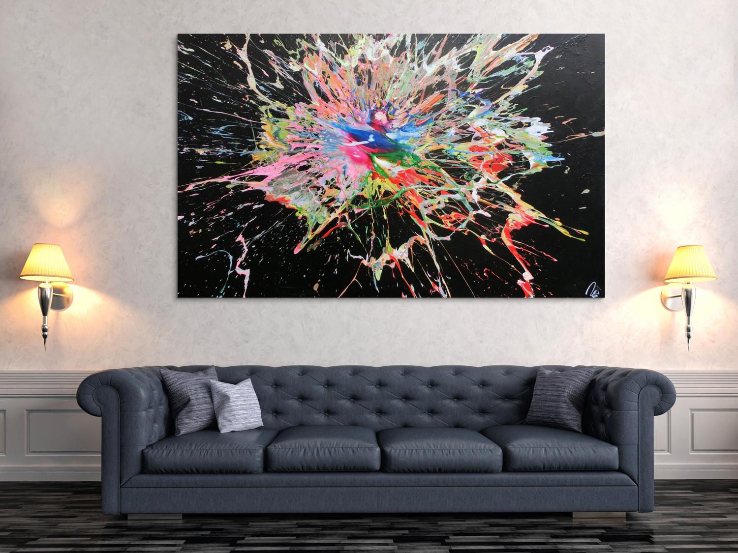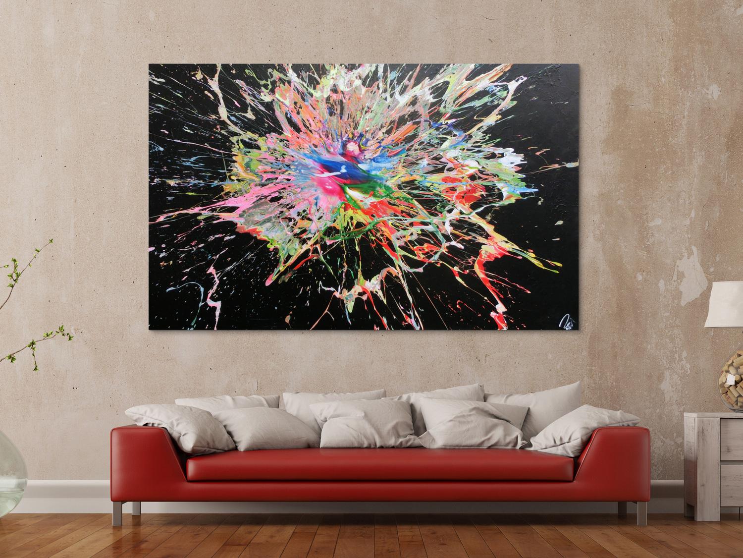 Abstraktes Gemälde auf Leinwand Abstraktes Acrylbild sehr bunt modern Action Painting Splash Art viele Farben bunter Fleck in 130x200cm von Alex Zerr