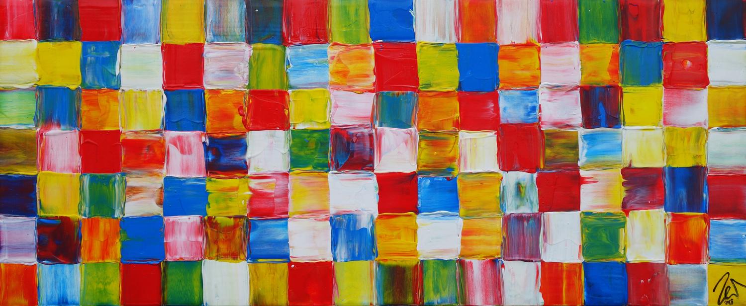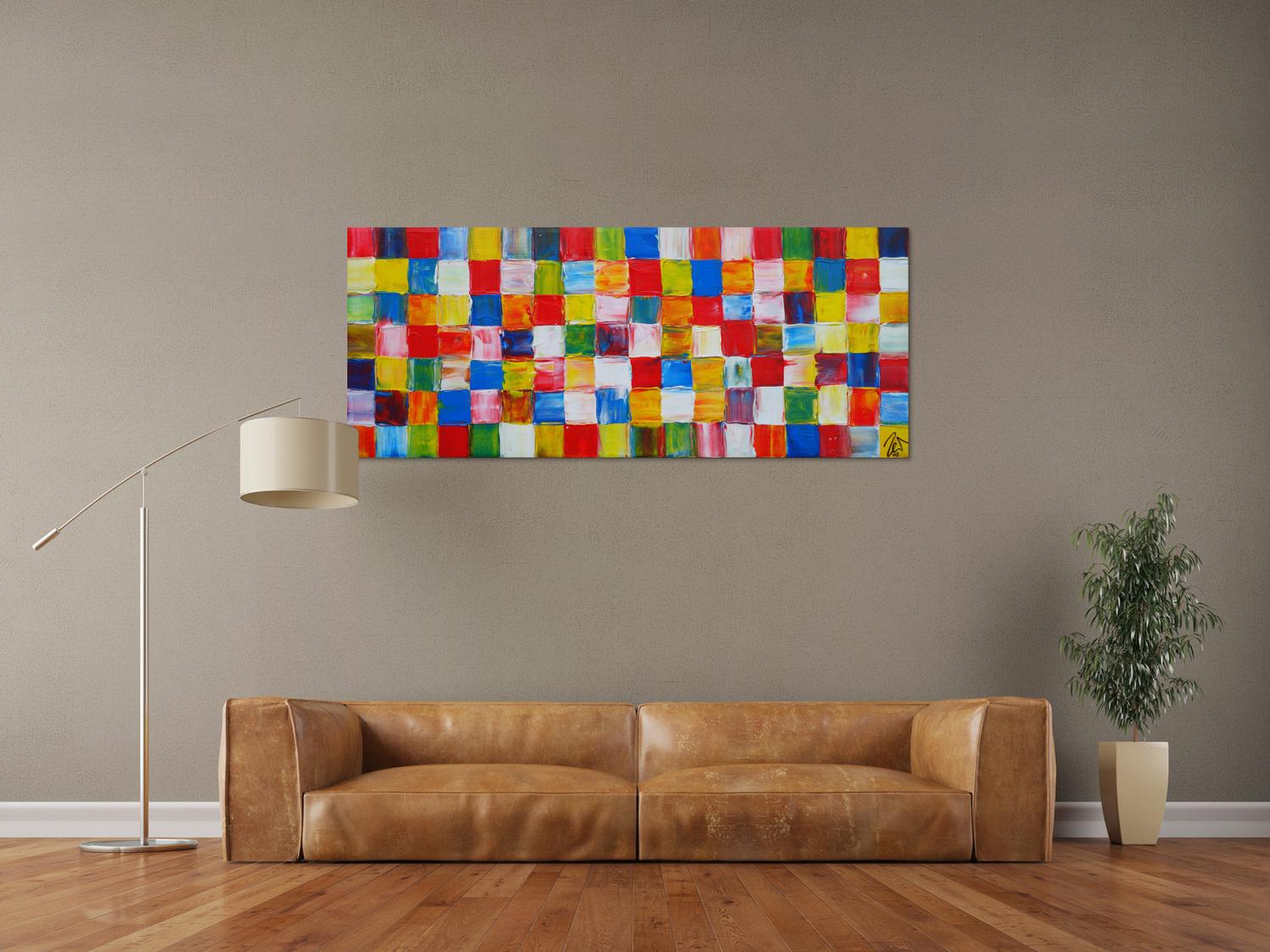 Abstraktes Gemälde auf Leinwand Abstraktes Acrylbild sehr bunt viele bunte Flächen Karomuster zeitgenössisch modern sehr farbig in 60x150cm von Alex Zerr