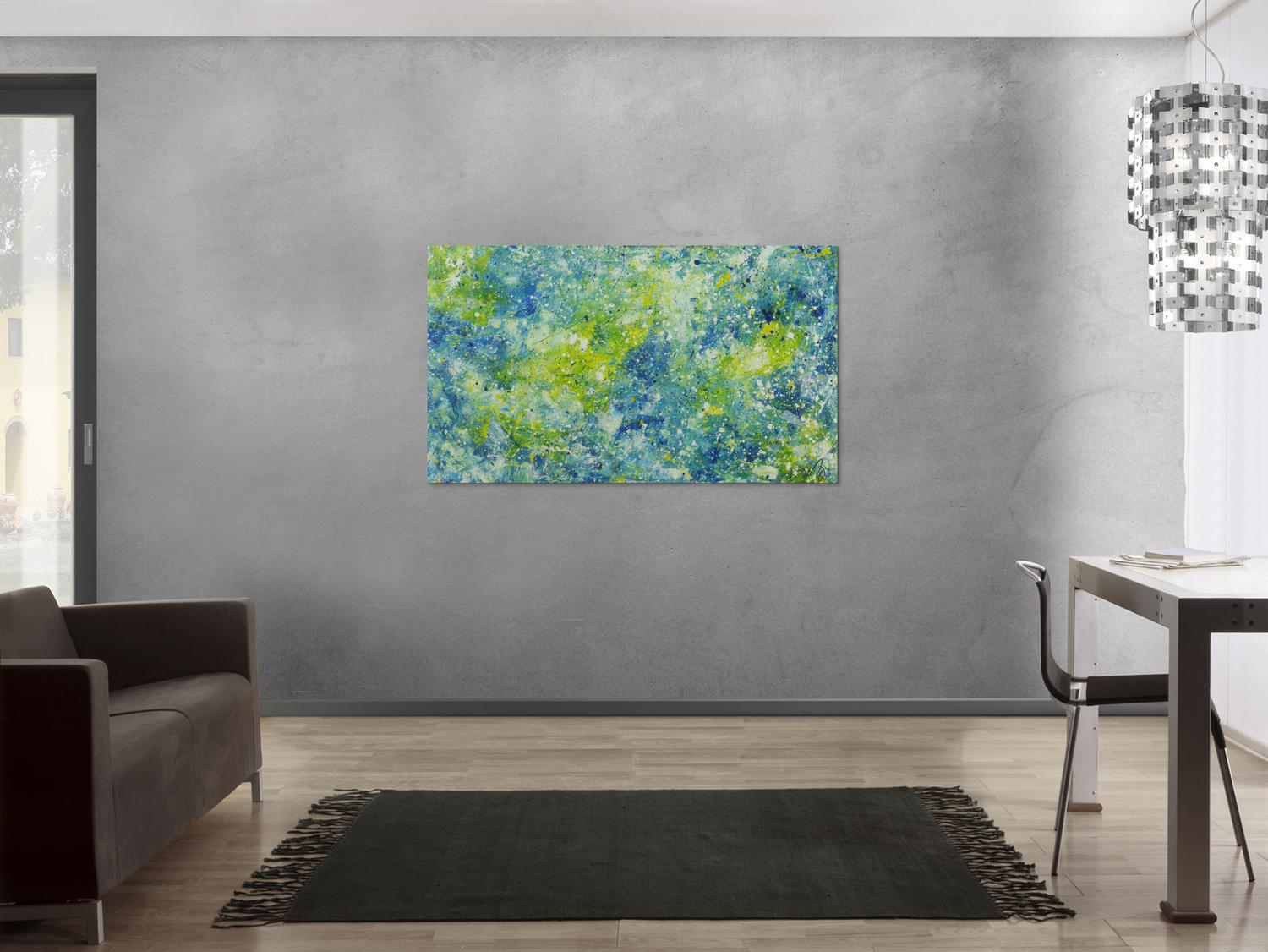 Abstraktes Acrylbild sehr modern blau türkis gelb grün weiß zeitgenössisch