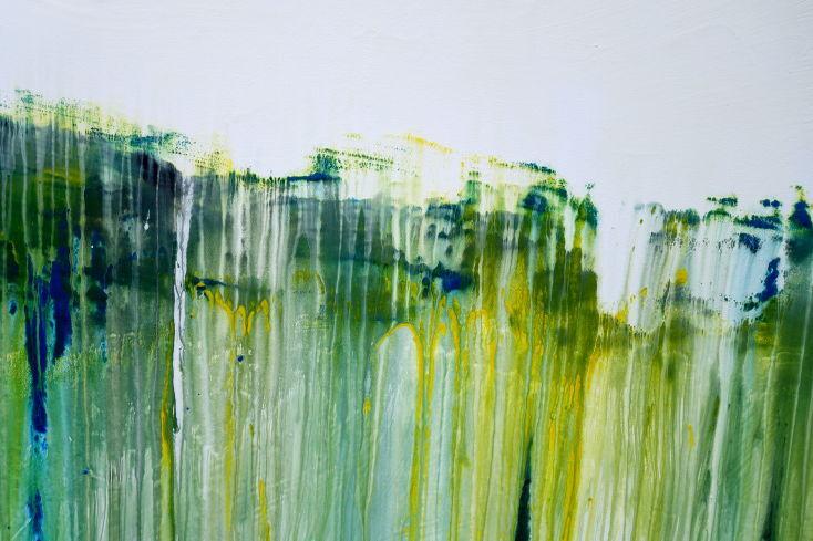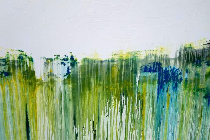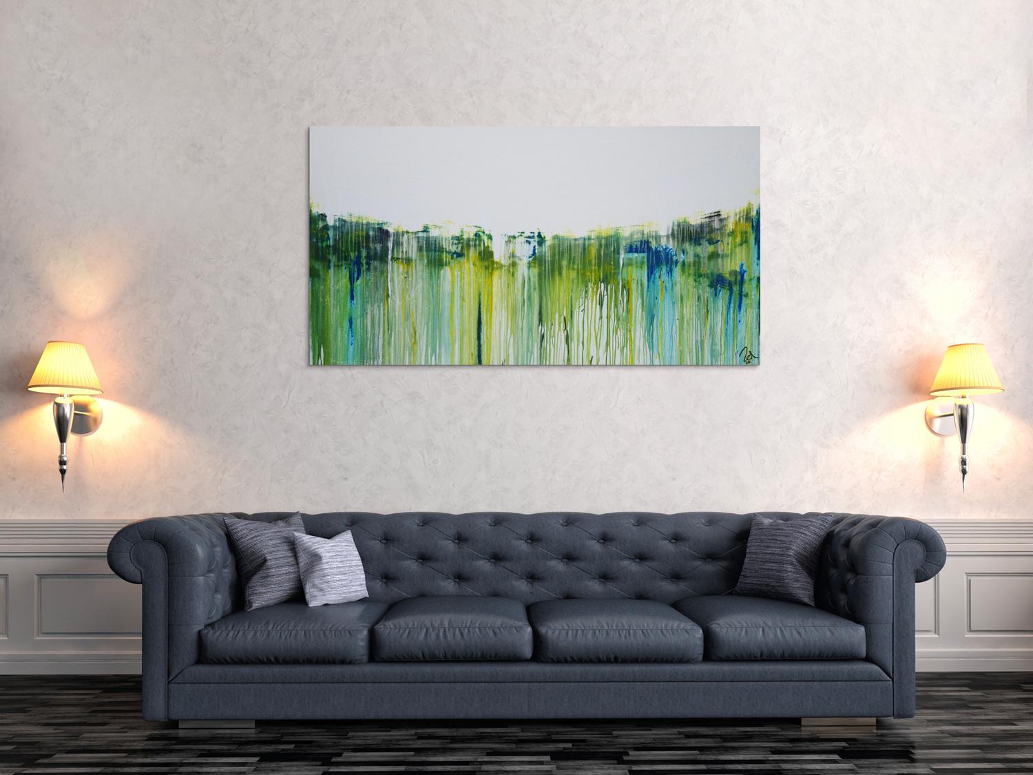 Abstraktes Gemälde auf Leinwand Abstraktes Acrylbild sehr modern in weiß gelb grüb blau Mischtechnik zeitgenössisch in 80x150cm von Alex Zerr