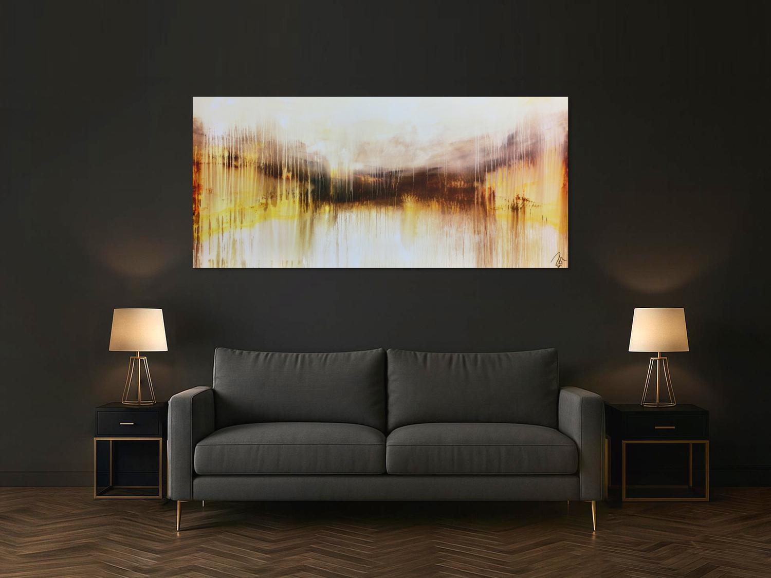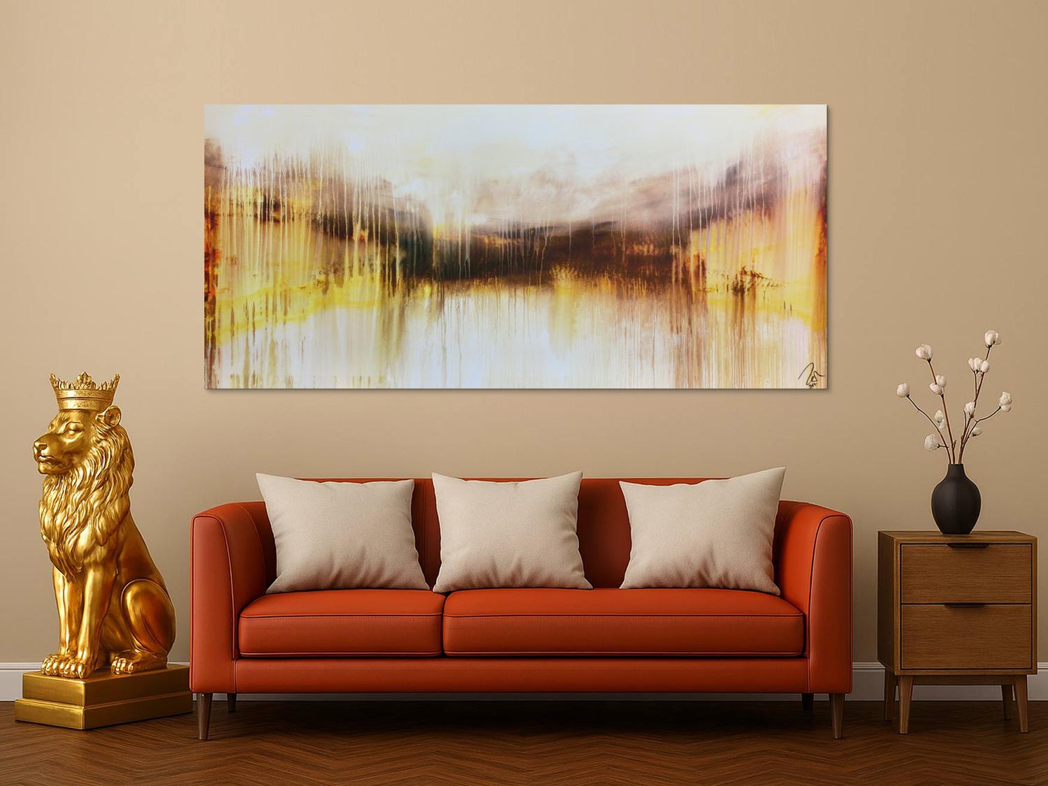 Dieses abstrakte Acrylbild ist ein handgemaltes Original vom Künstler Alex Zerr aus Bad Lisppringe und ist im Jahr 2017 in seinem Atelier entstanden. Das Bild hat eine Größe von 90x200cm und ist bereits auf einem hochwertigen und stabilem Rahmen aufgespannt. Dadurch kann das Bild nach der Lieferung direkt an die Wand gehängt werden und sofort in Ihrem Raum wirken. Alle Seiten des Gemäldes sind passend zum Motiv bemalt, so dass kein zusätzlicher Rahmen benötigt wird.