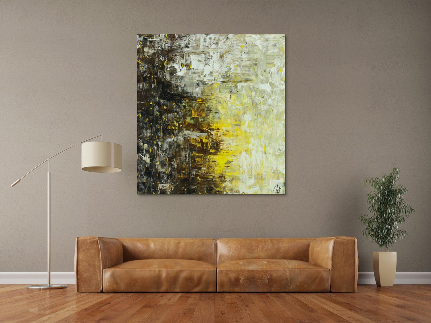 Abstraktes Gemälde auf Leinwand Abstraktes Acrylbild Spachteltechnik mediterrane Farben braun gelb weiß schwarz sehr modern in 130x120cm von Alex Zerr
