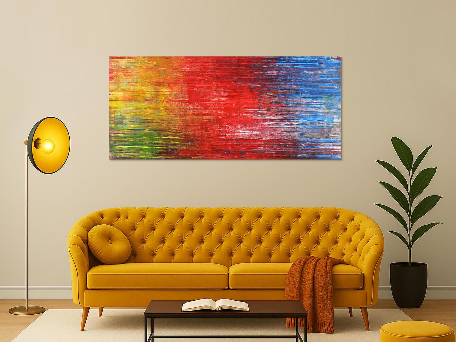 Abstraktes Gemälde auf Leinwand Abstraktes Acrylbild Spachteltechnik modern zeitgenössisch expressionistisch bunt rot glau gelb in 80x180cm von Alex Zerr