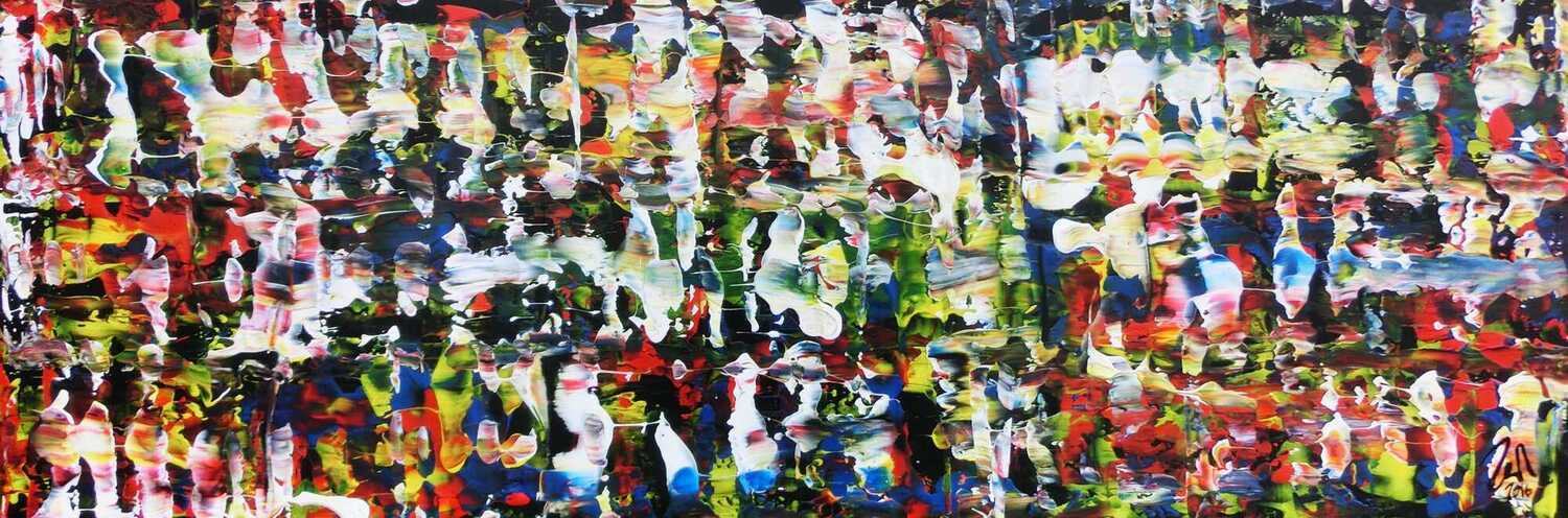 Dieses abstrakte Acrylbild ist ein handgemaltes Original vom Künstler Alex Zerr aus Bad Lisppringe und ist im Jahr 2016 in seinem Atelier entstanden. Das Bild hat eine Größe von 50x150cm und ist bereits auf einem hochwertigen und stabilem Rahmen aufgespannt. Dadurch kann das Bild nach der Lieferung direkt an die Wand gehängt werden und sofort in Ihrem Raum wirken. Alle Seiten des Gemäldes sind passend zum Motiv bemalt, so dass kein zusätzlicher Rahmen benötigt wird.