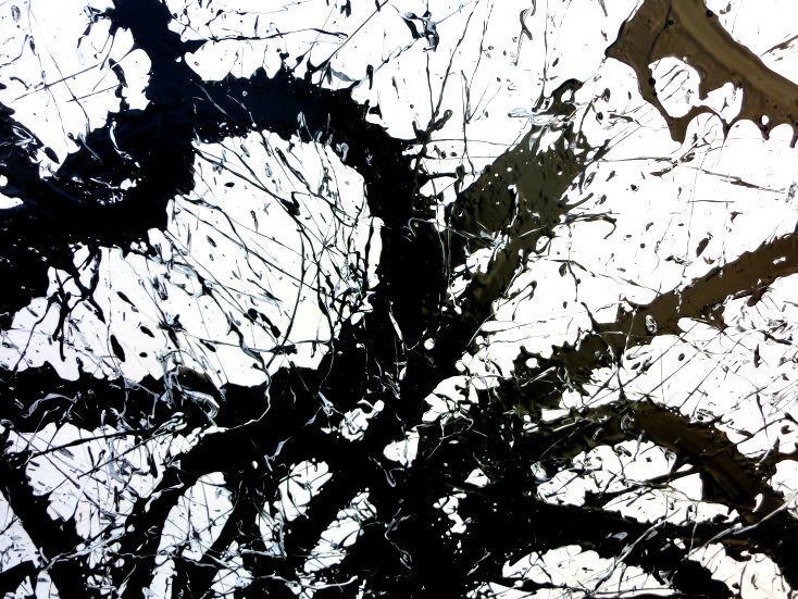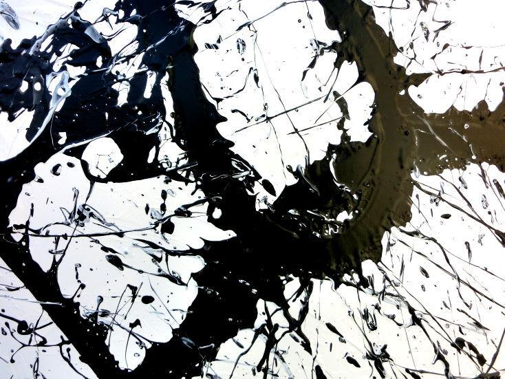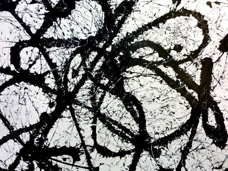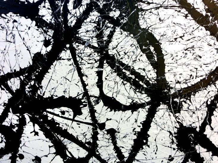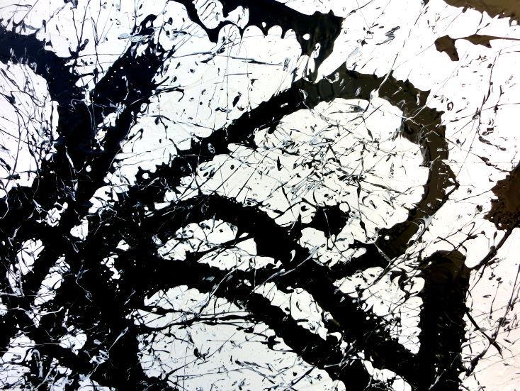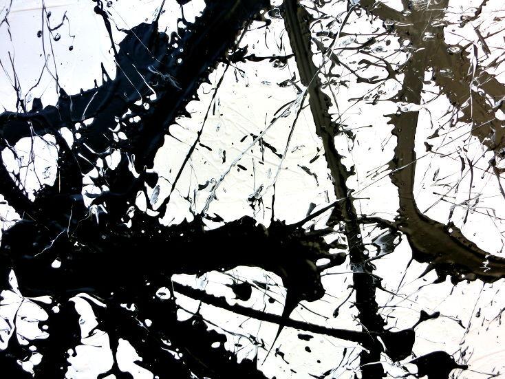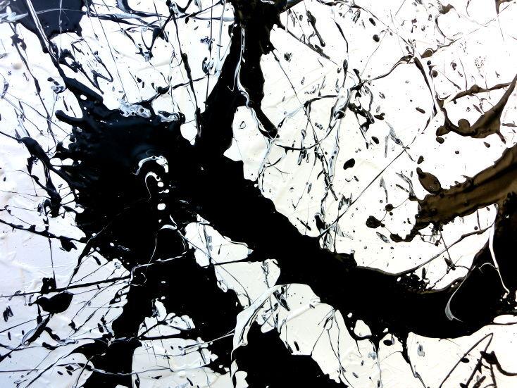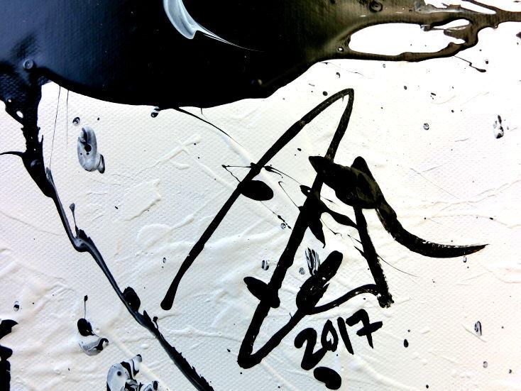 Abstraktes Acrylgemälde quadratisch schwarz weiß minimalistisch Actionpainting
