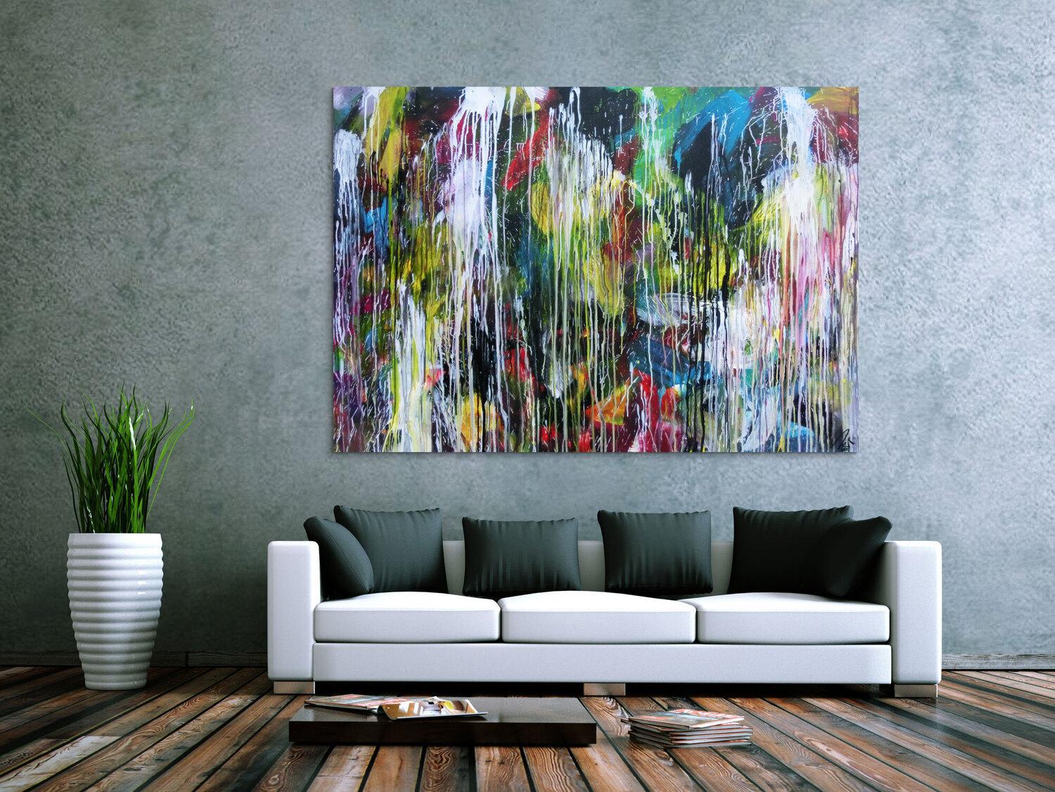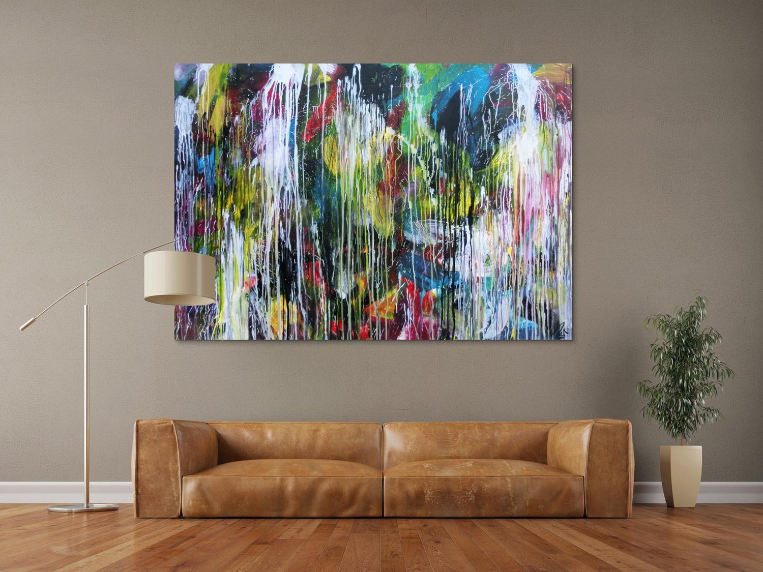Abstraktes Gemälde auf Leinwand Abstraktes Acrylgemälde sehr bunt Mischtechnik Action Painting sehr modern in 130x180cm von Alex Zerr
