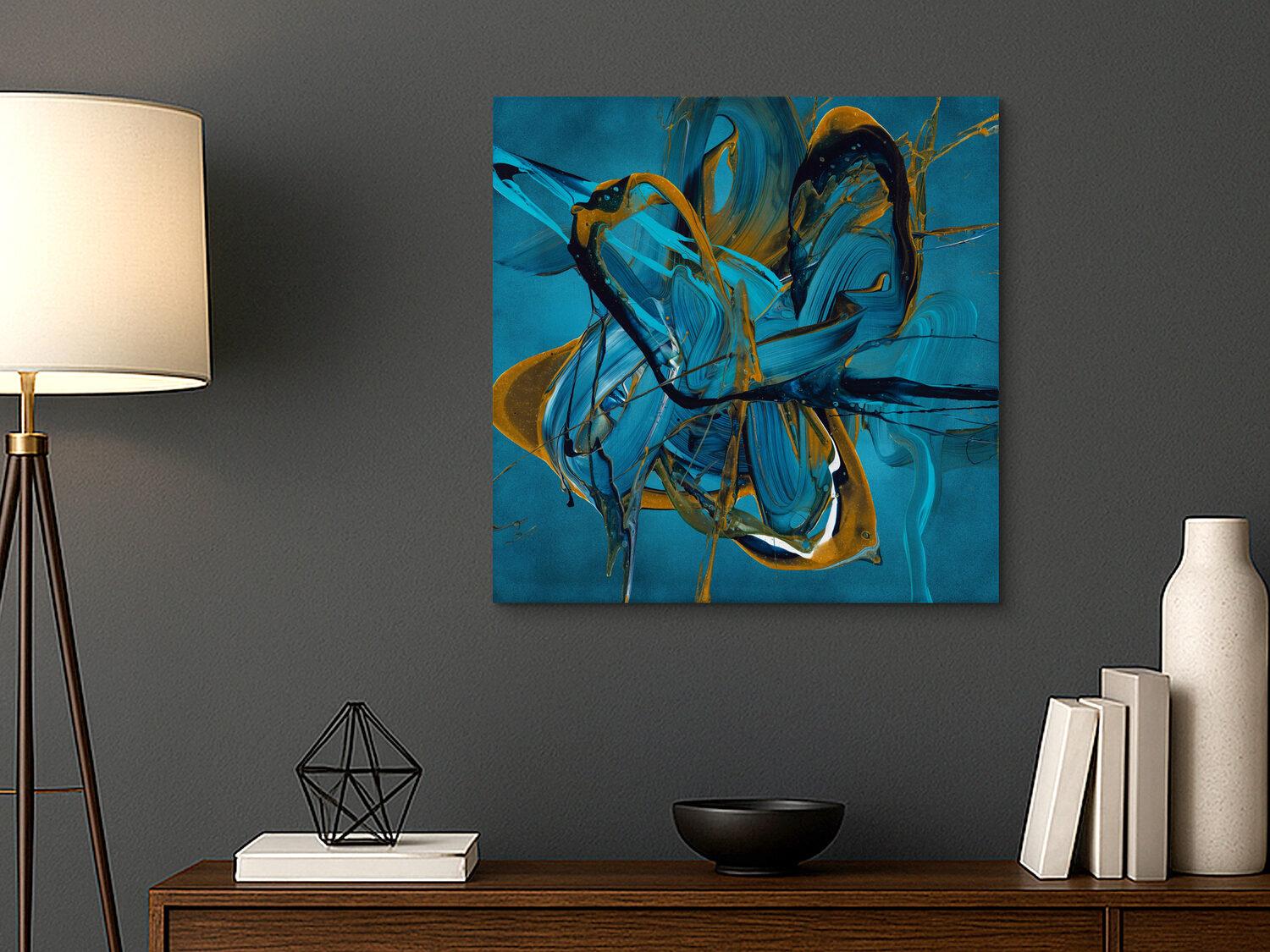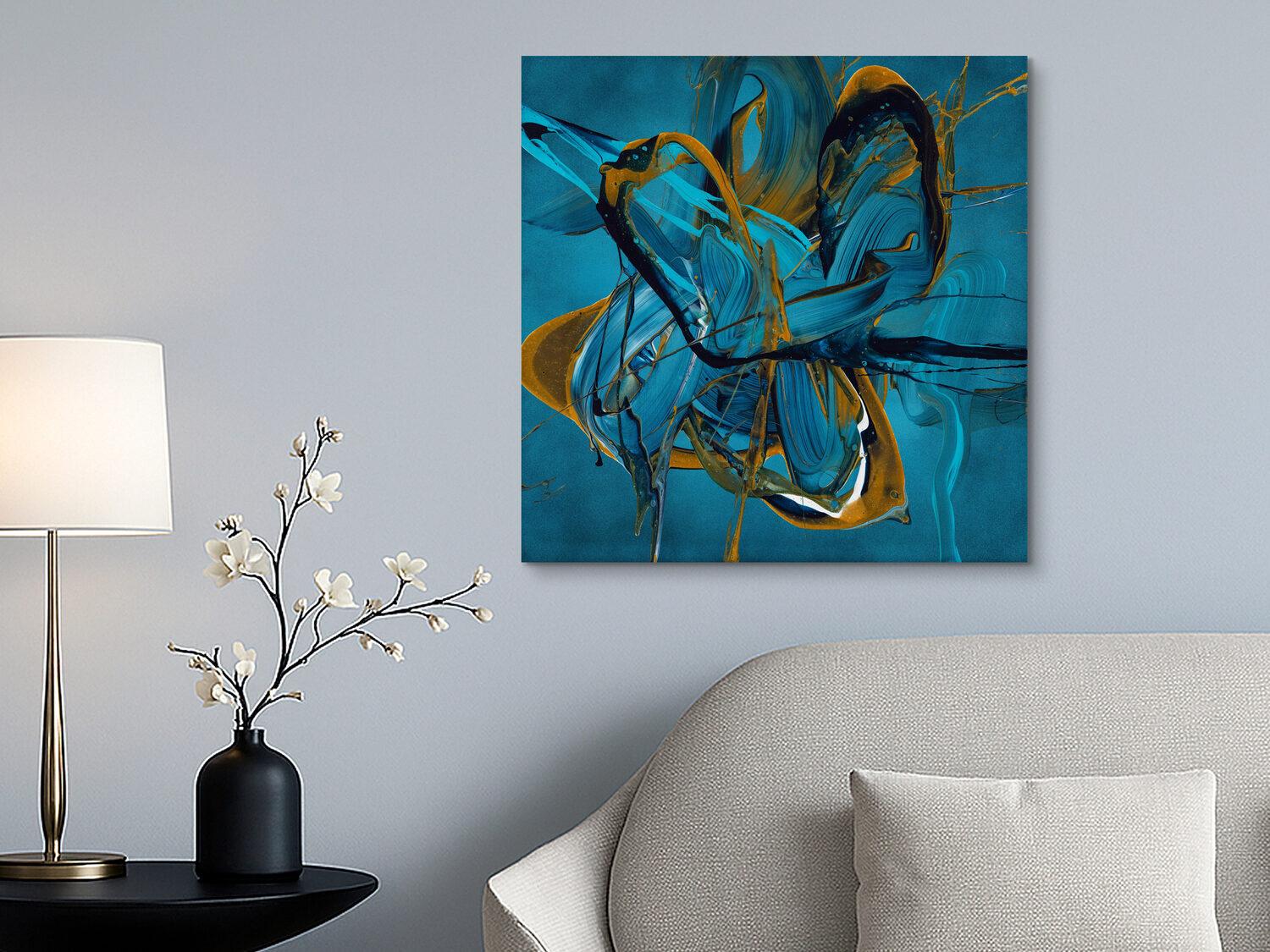 Dynamische Farbexplosionen in satten Blau- und Türkistönen verschmelzen mit goldenen Akzenten zu einem energiegeladenen Kunstwerk. Die spontane Action Painting-Technik verleiht Ihrem Raum lebendige Tiefe und moderne Eleganz. Ein kraftvolles Original, das Bewegung und Ruhe zugleich ausstrahlt.