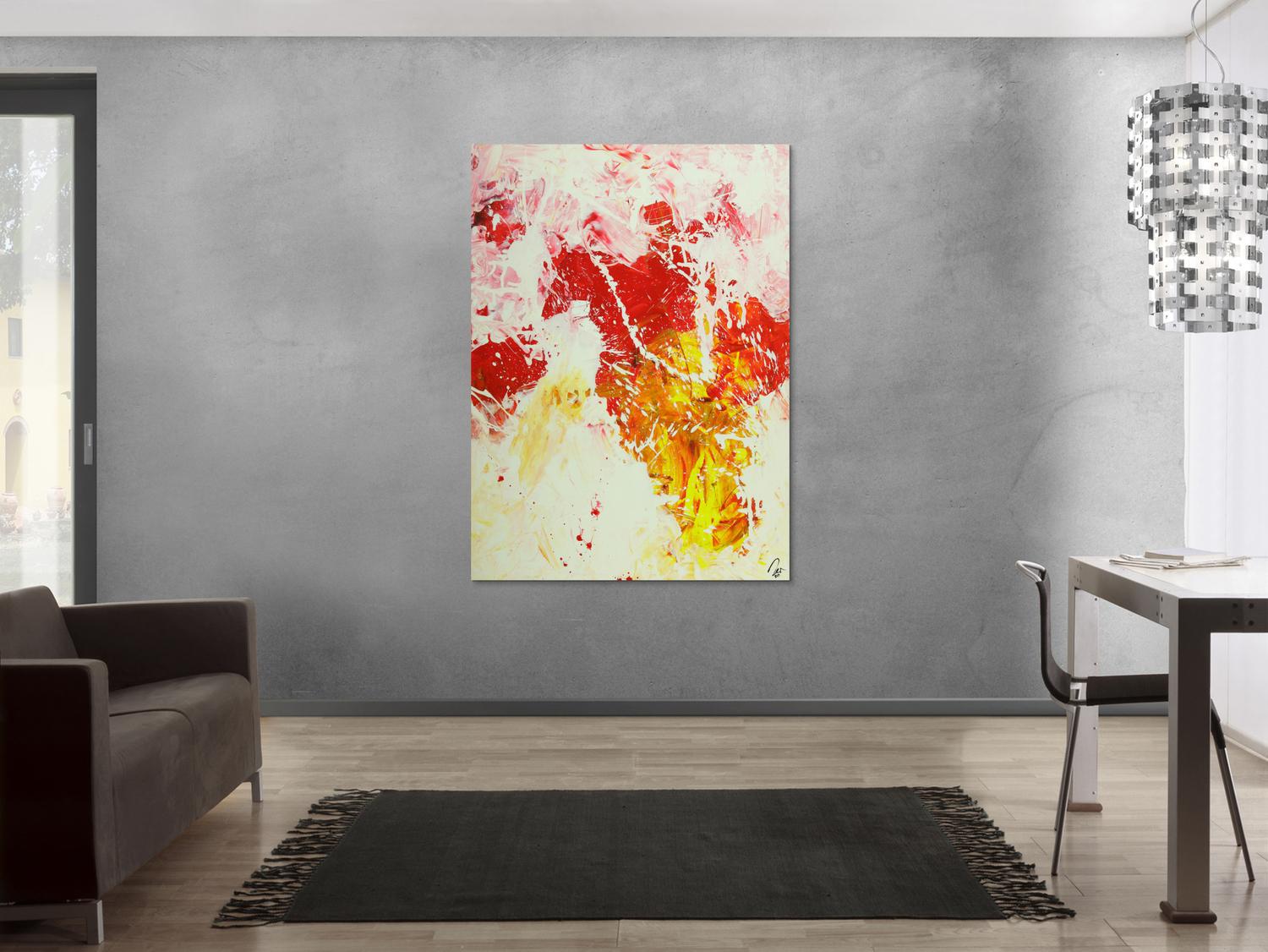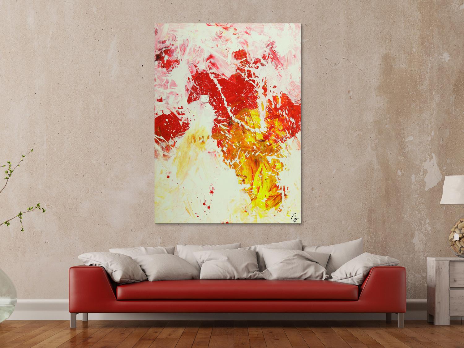Abstraktes Gemälde Action Painting hochformat weiß rot gelb rosa handgemalt