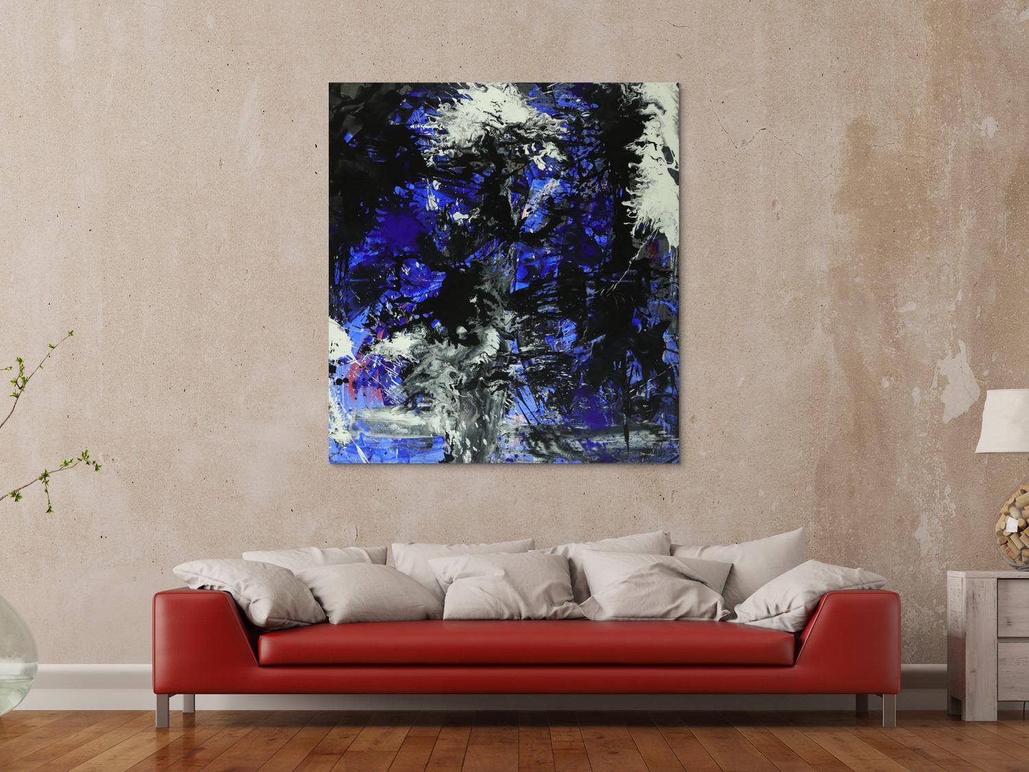 Abstraktes Gemälde auf Leinwand Action Painting blau schwarz