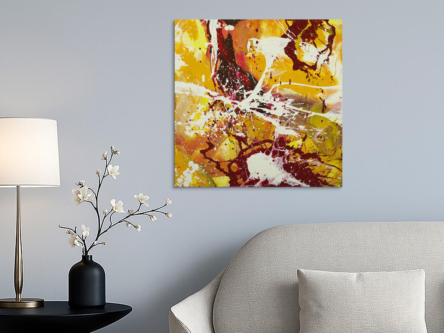 Dieses abstrakte Acrylbild ist ein handgemaltes Original vom Künstler Alex Zerr aus Bad Lisppringe und ist im Jahr 2020 in seinem Atelier entstanden. Das Bild hat eine Größe von 70x70cm und ist bereits auf einem hochwertigen und stabilem Rahmen aufgespannt. Dadurch kann das Bild nach der Lieferung direkt an die Wand gehängt werden und sofort in Ihrem Raum wirken. Alle Seiten des Gemäldes sind passend zum Motiv bemalt, so dass kein zusätzlicher Rahmen benötigt wird.