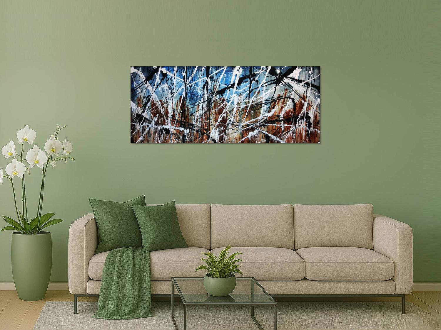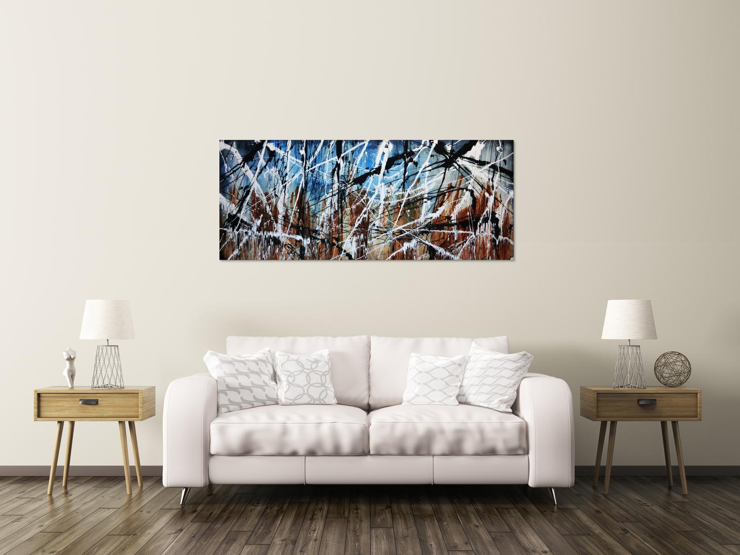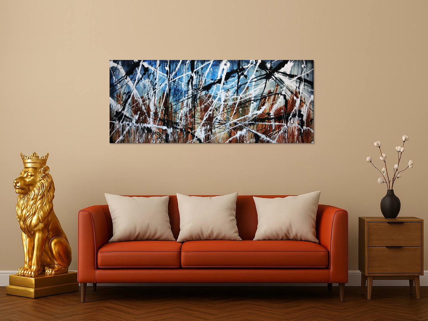 Dieses abstrakte Acrylbild ist ein handgemaltes Original vom Künstler Alex Zerr aus Bad Lisppringe und ist im Jahr 2014 in seinem Atelier entstanden. Das Bild hat eine Größe von 70x160cm und ist bereits auf einem hochwertigen und stabilem Rahmen aufgespannt. Dadurch kann das Bild nach der Lieferung direkt an die Wand gehängt werden und sofort in Ihrem Raum wirken. Alle Seiten des Gemäldes sind passend zum Motiv bemalt, so dass kein zusätzlicher Rahmen benötigt wird.