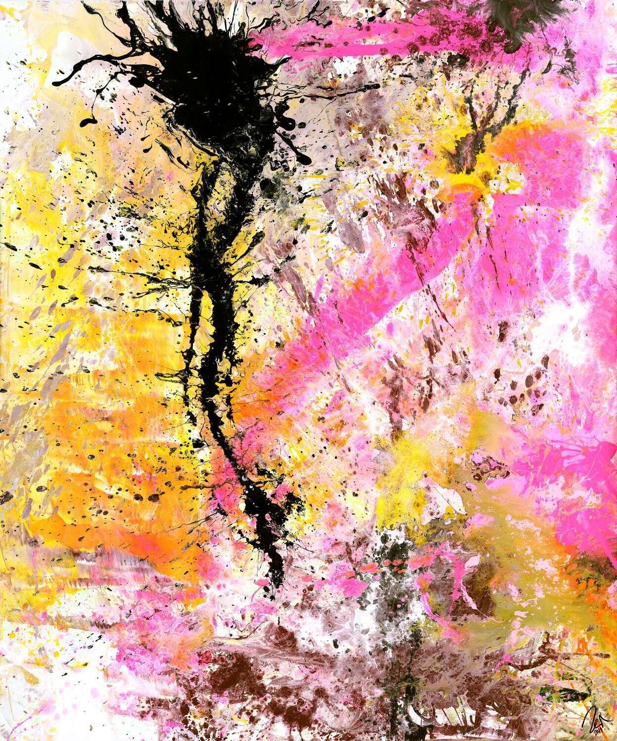 Abstraktes Gemälde Modern Art Action Painting neon Farben weiß pink gelb schwarz hochformat