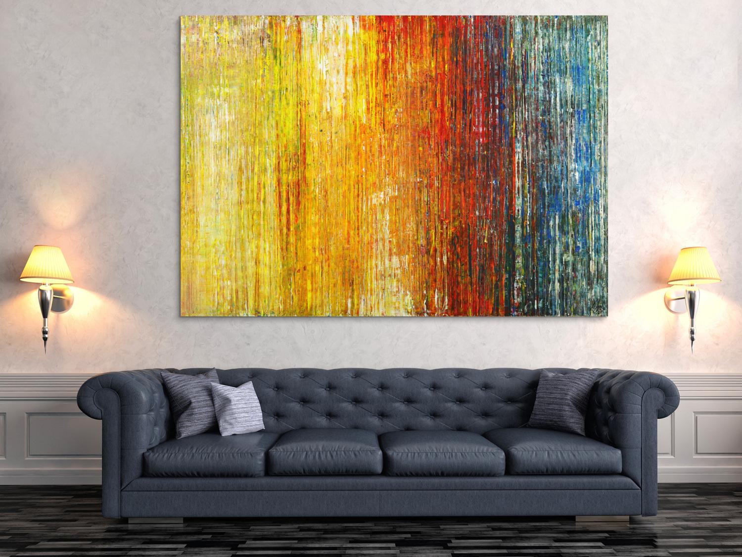 Abstraktes Gemälde auf Leinwand Abstraktes Gemälde Spachteltehnik Modern Art gelb orange weiß rot blau bunte Farben handgemalt in 140x200cm von Alex Zerr