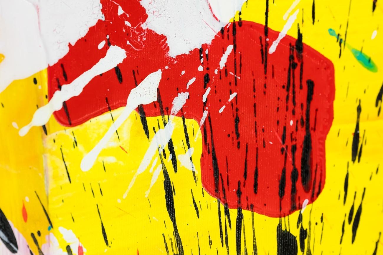 Abstraktes Gemälde auf Leinwand Abstraktes Original Gemälde 80x150cm Action Painting Modern Art handgemalt Splash Art weiß gelb pink hochwertig in 80x150cm von Alex Zerr